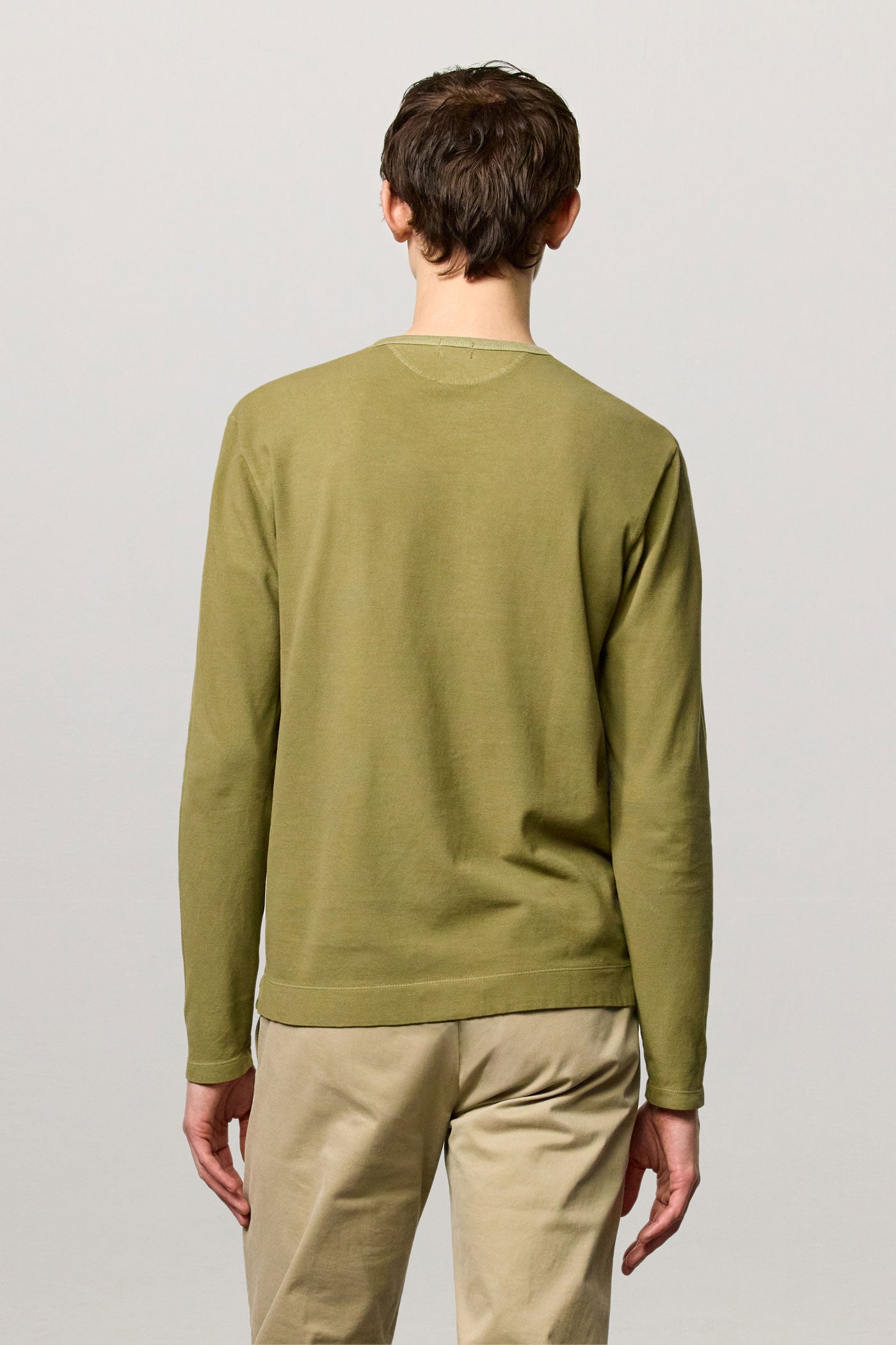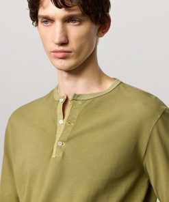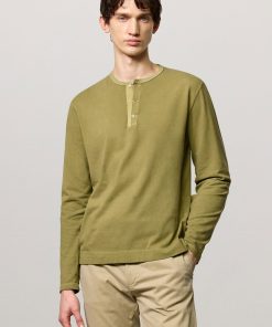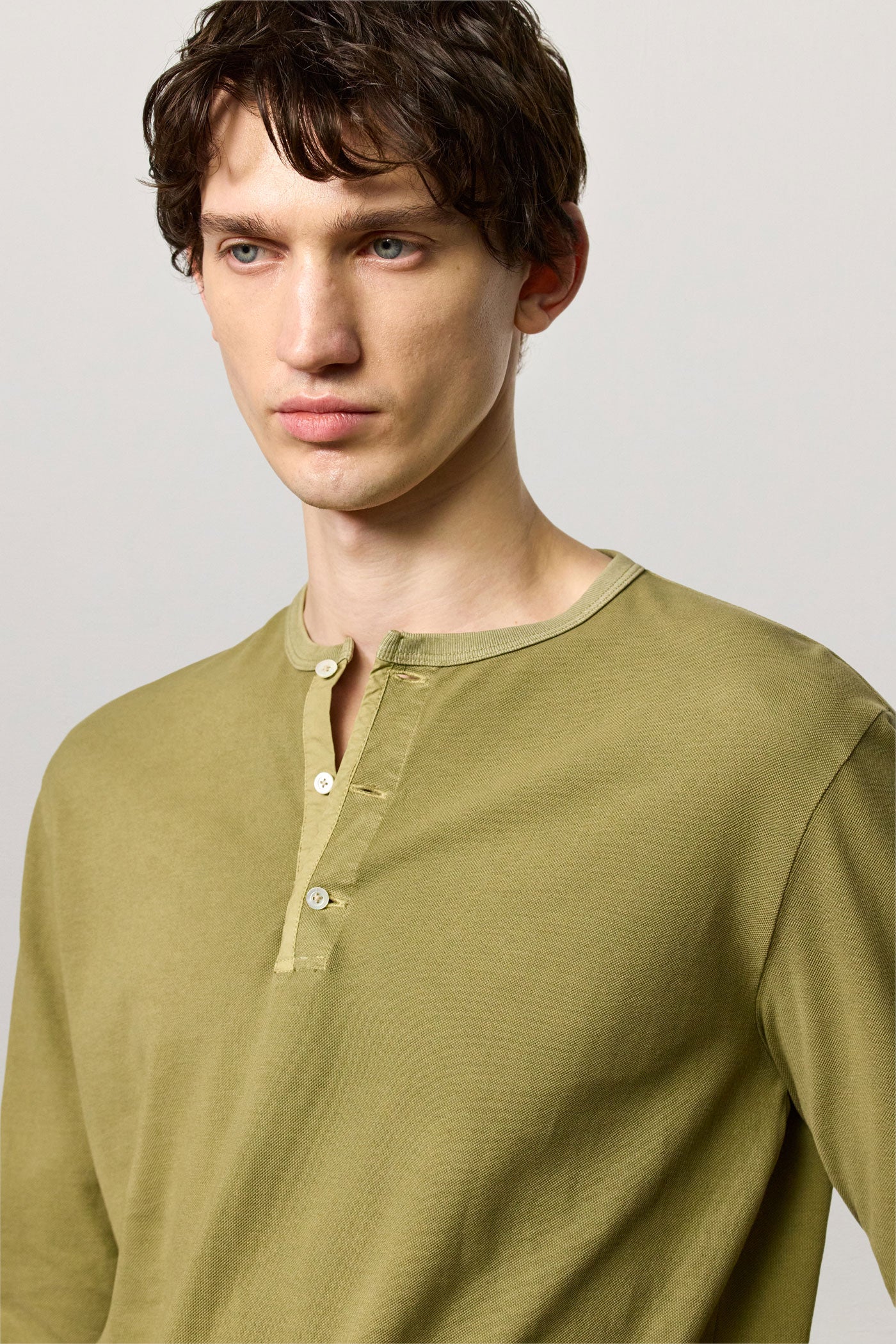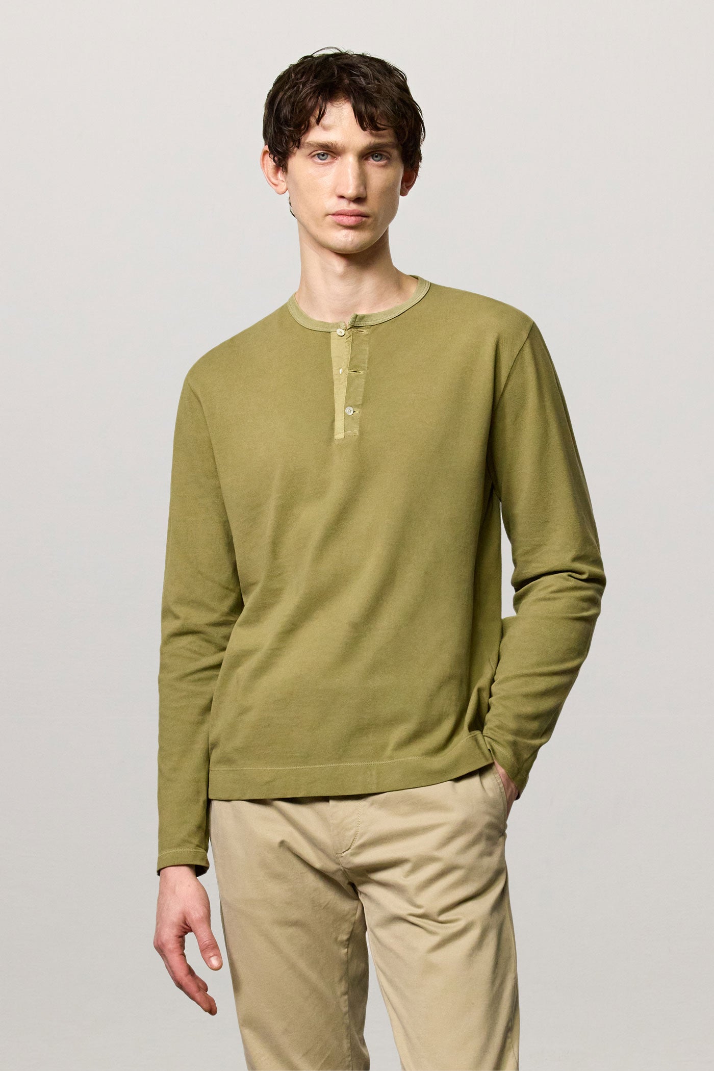 Long-sleeved T-shirt with band collar, partial opening with three mother-of-pearl buttons and a regular fit. Crafted from cotton-cashmere jersey. Made in Italy.