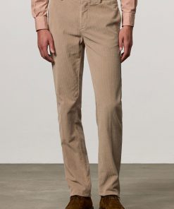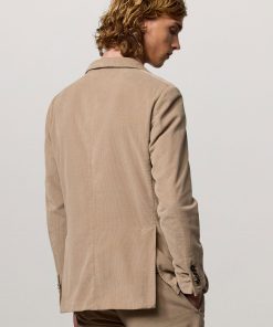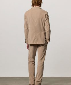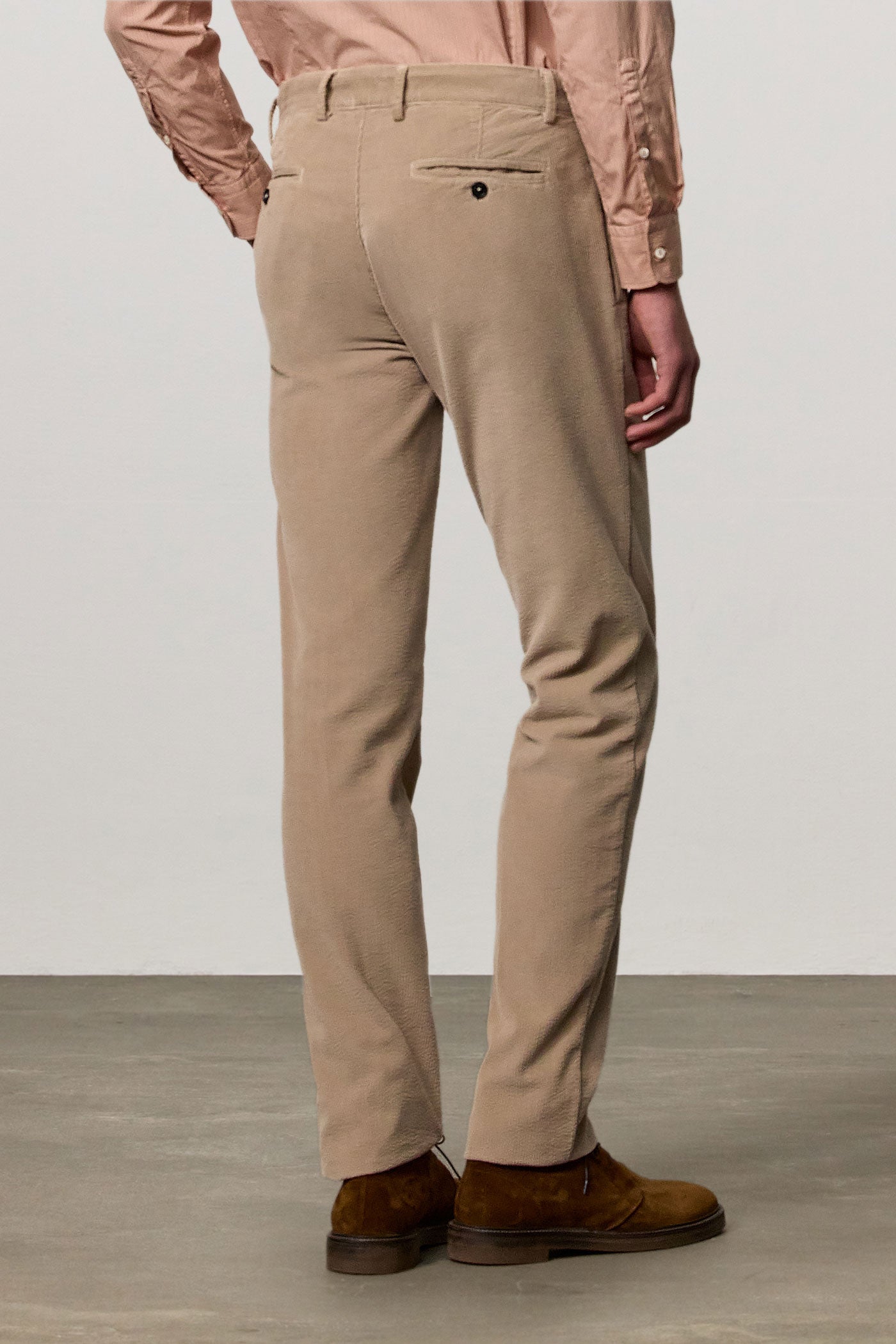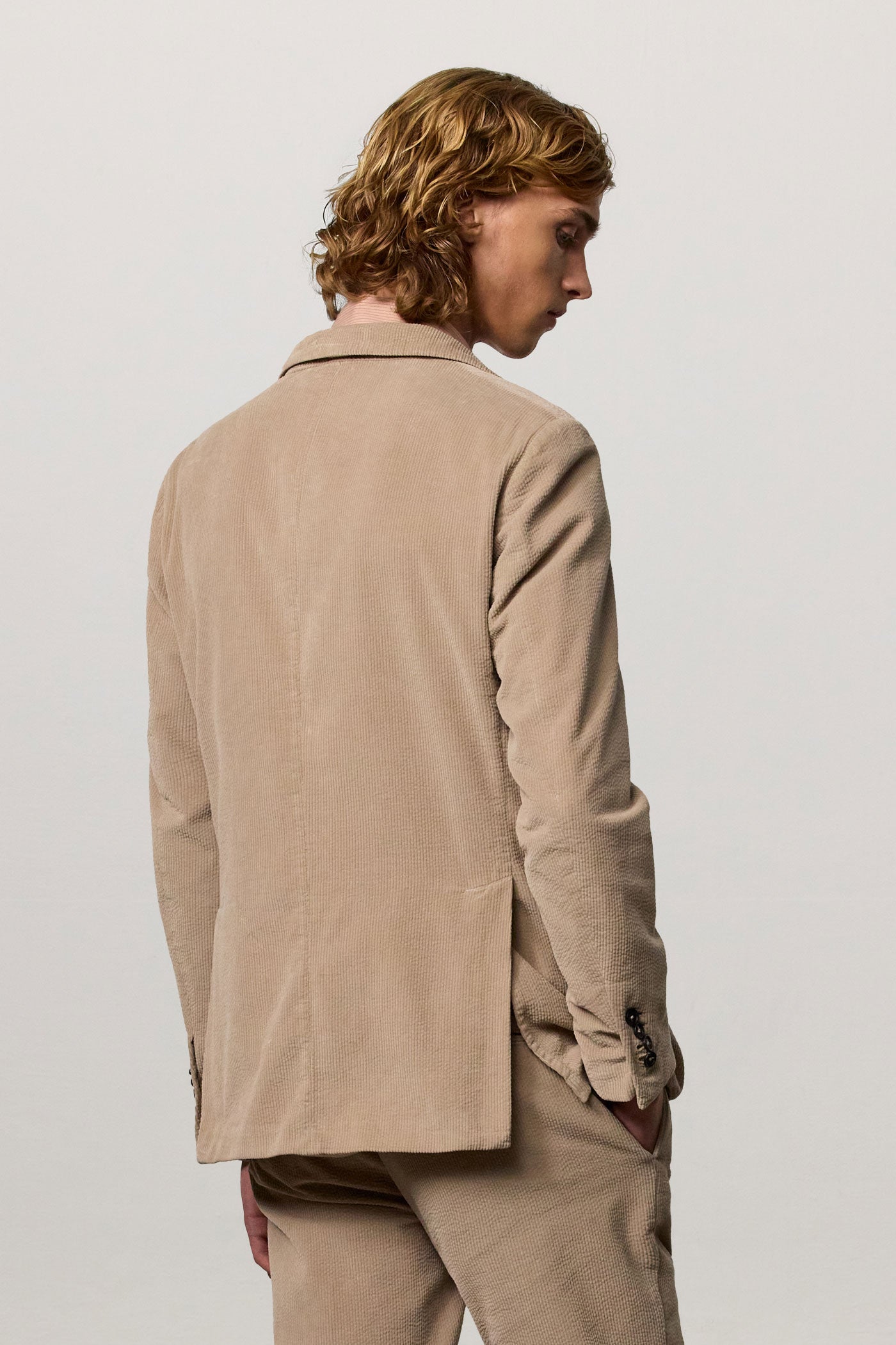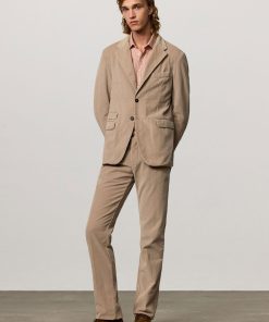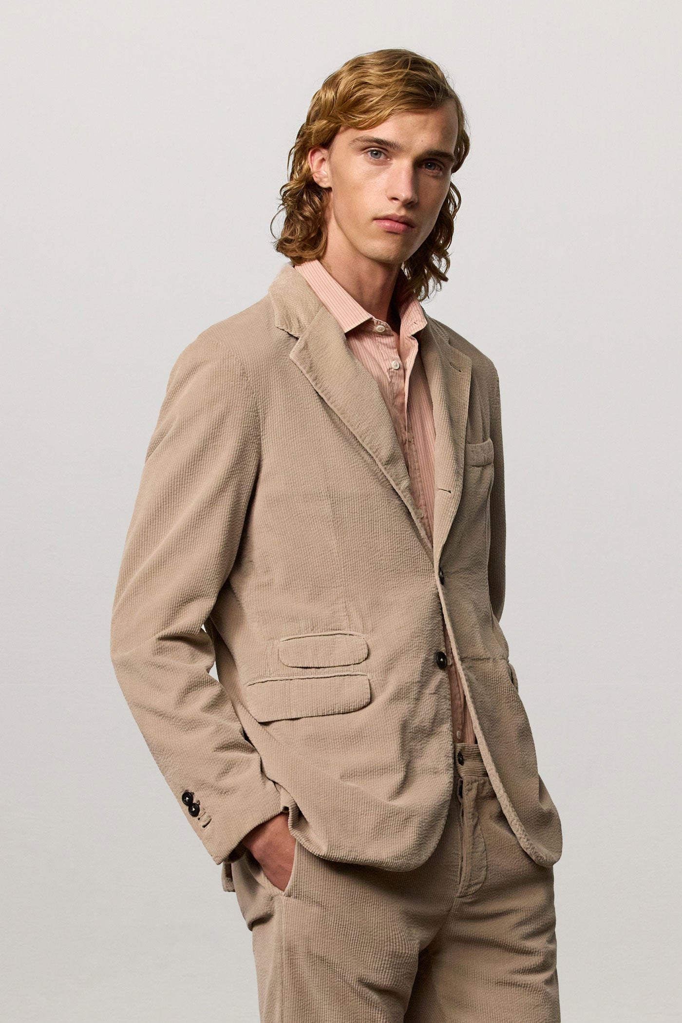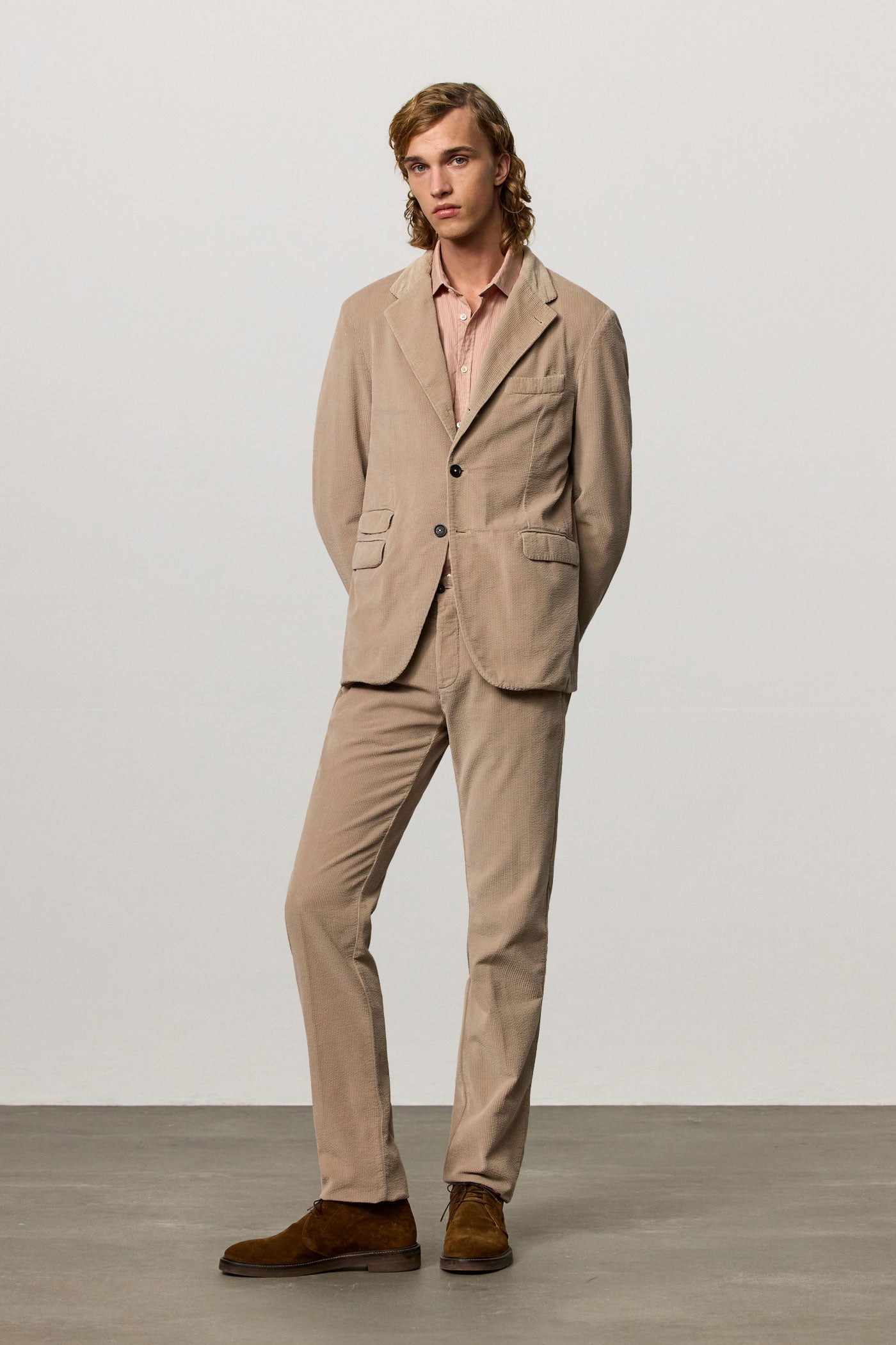 Casual deconstructed suit with three-button jacket, regular fit, classic notched lapel with stitching, flap pockets, dark horn buttons, two back vents, flat-front trousers, slim fit, straight leg, made in cotton corduroy. Made in Italy.