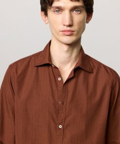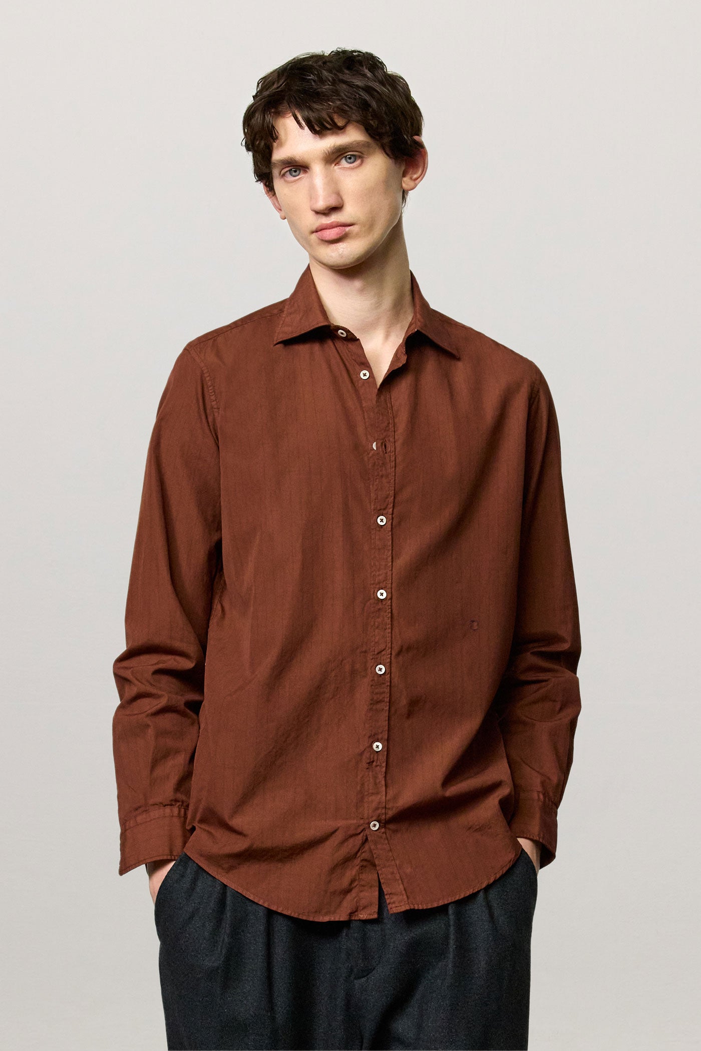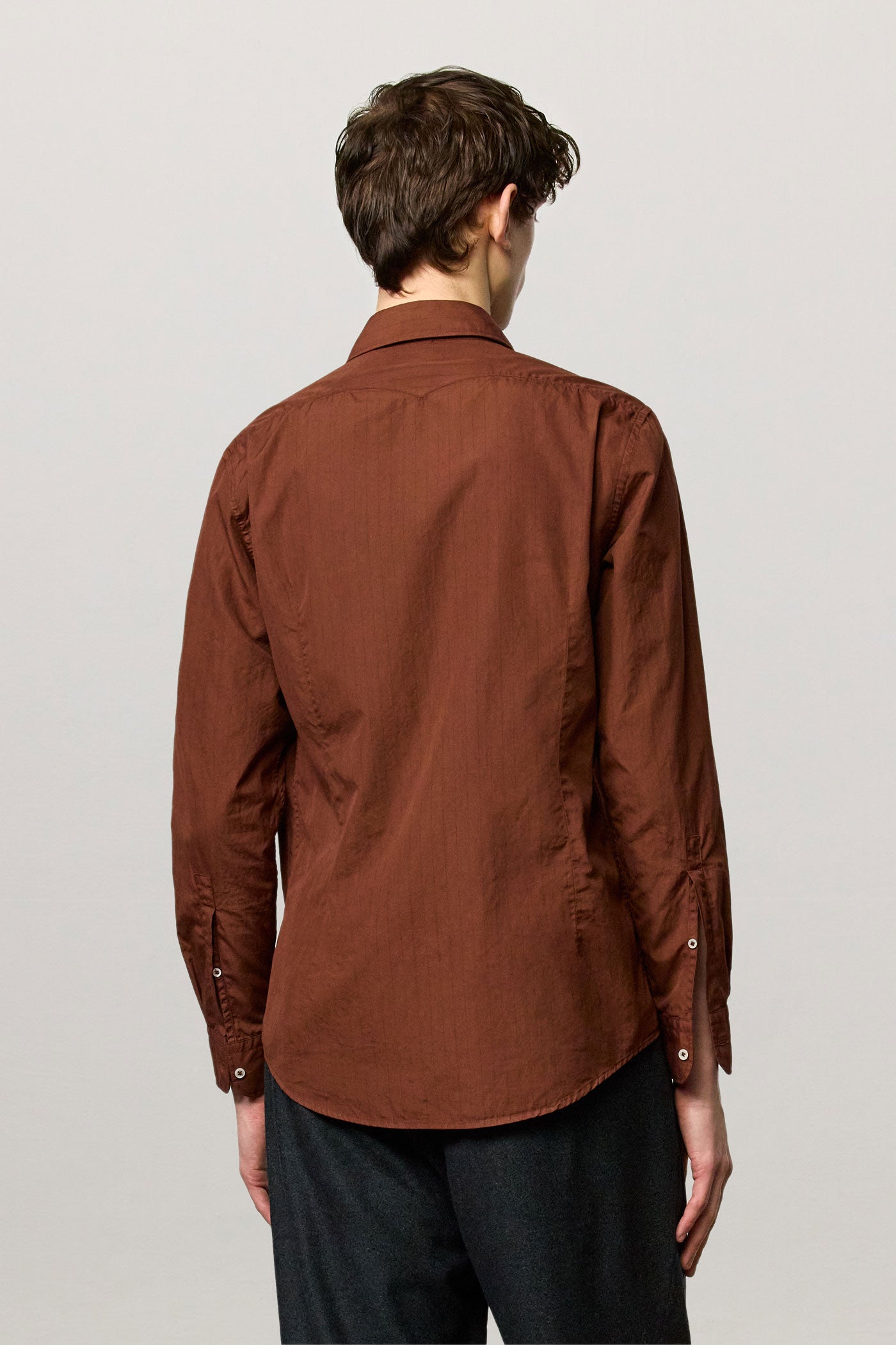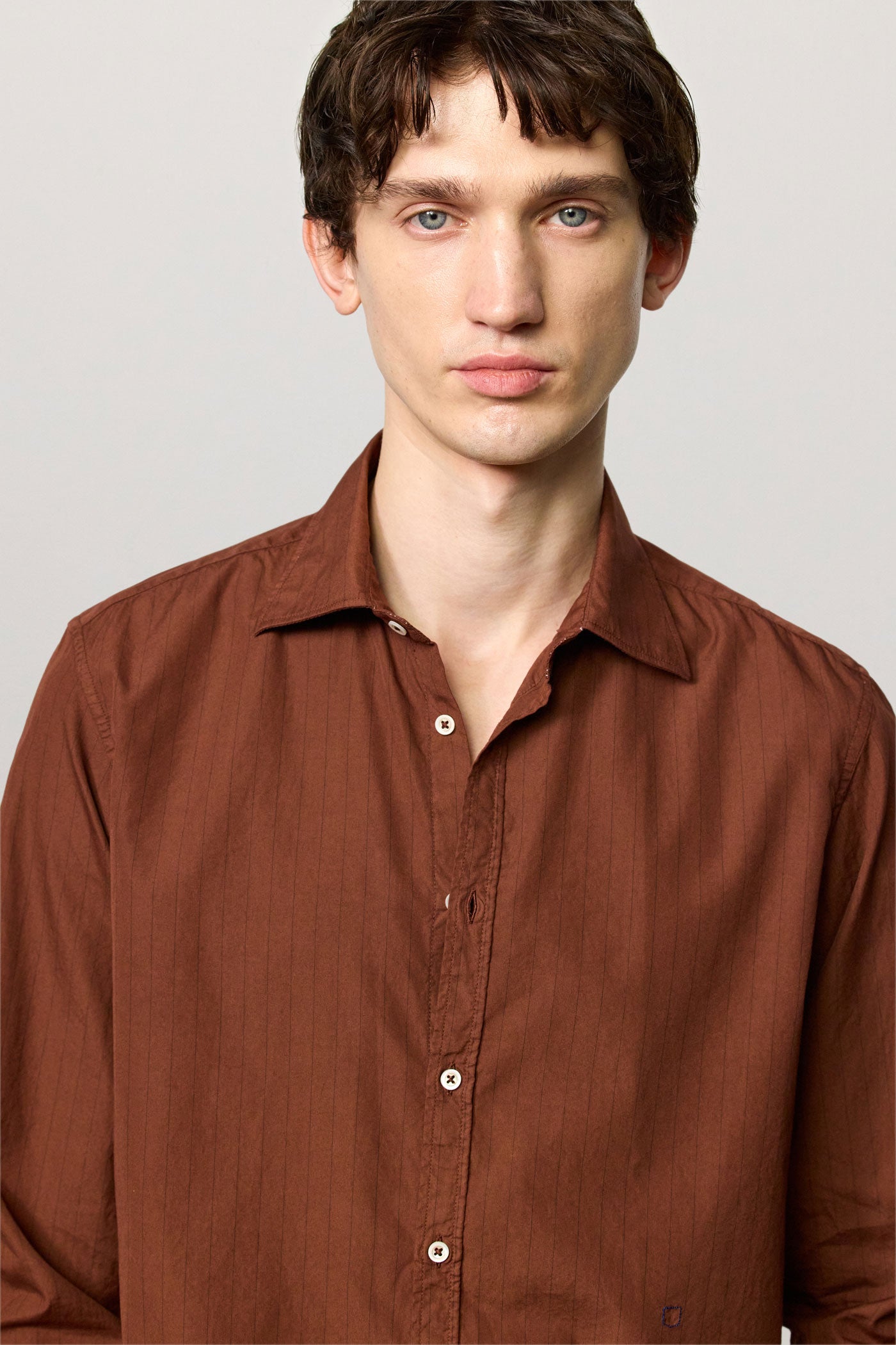 Shirt with pointed collar, front closure, cotton voile plastron detail and embroidered crest for numbering. Pointed back yoke with rounded hem. Regular fit. Crafted from striped cotton with a watercolor effect. Made in Italy.