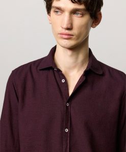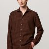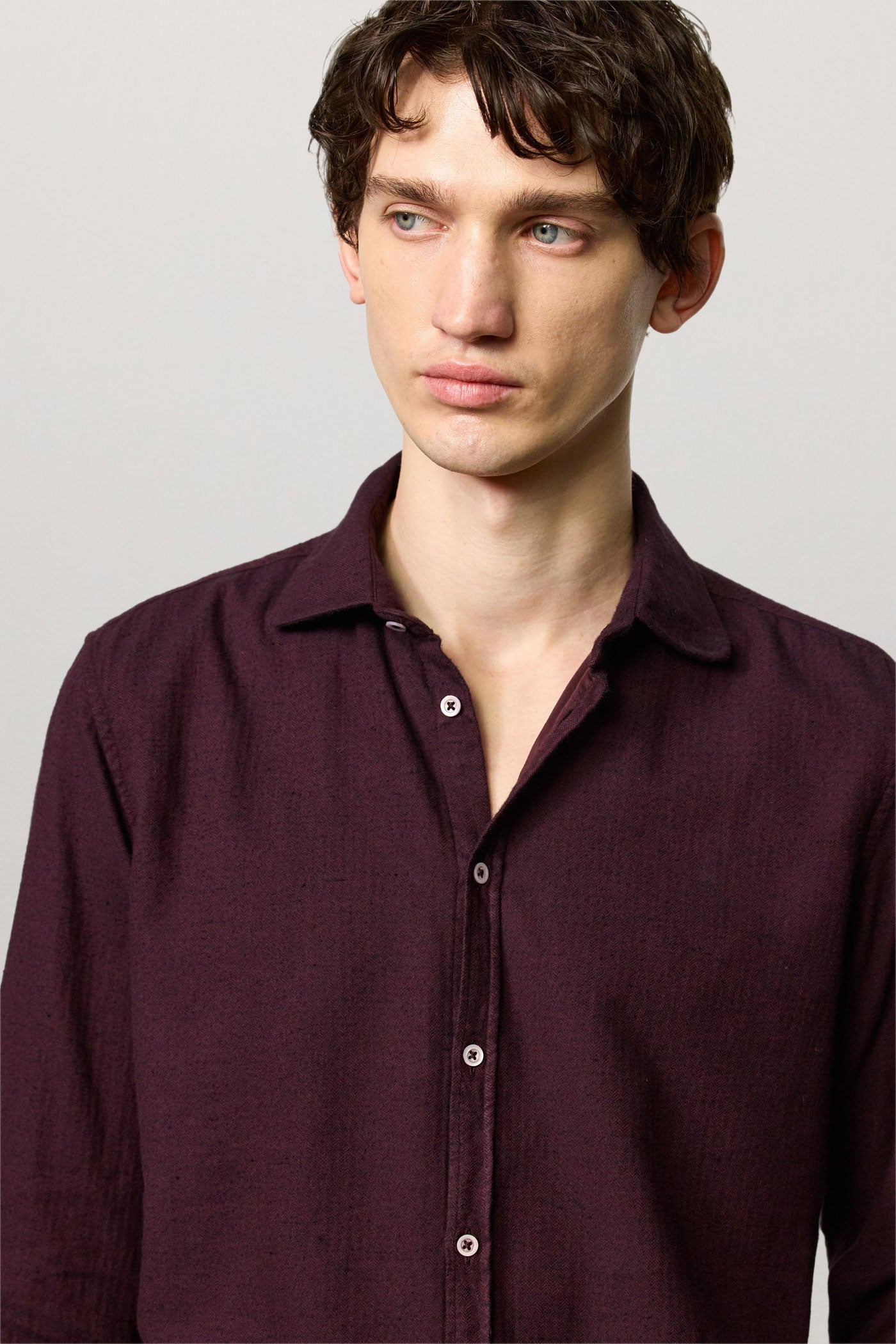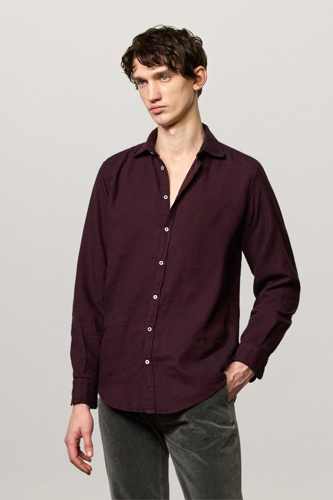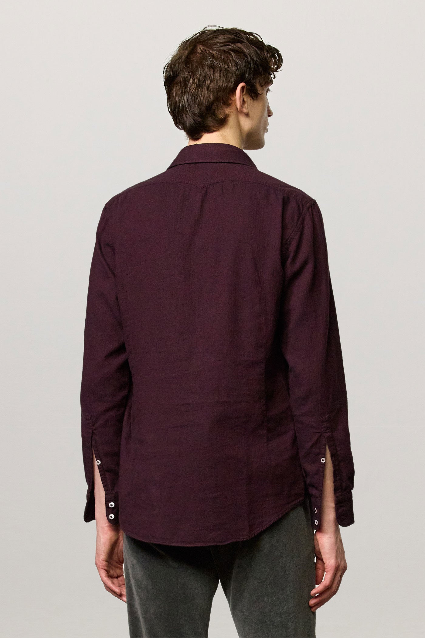 Shirt with a soft rounded collar, front closure, internal cotton voile plastron detail and embroidered crest for numbering. Pointed back yoke and rounded hem. Classic fit. Crafted from brushed cotton micro herringbone with a watercolor effect. Made in Italy.