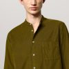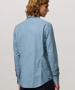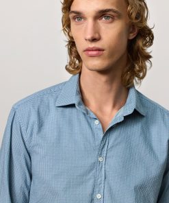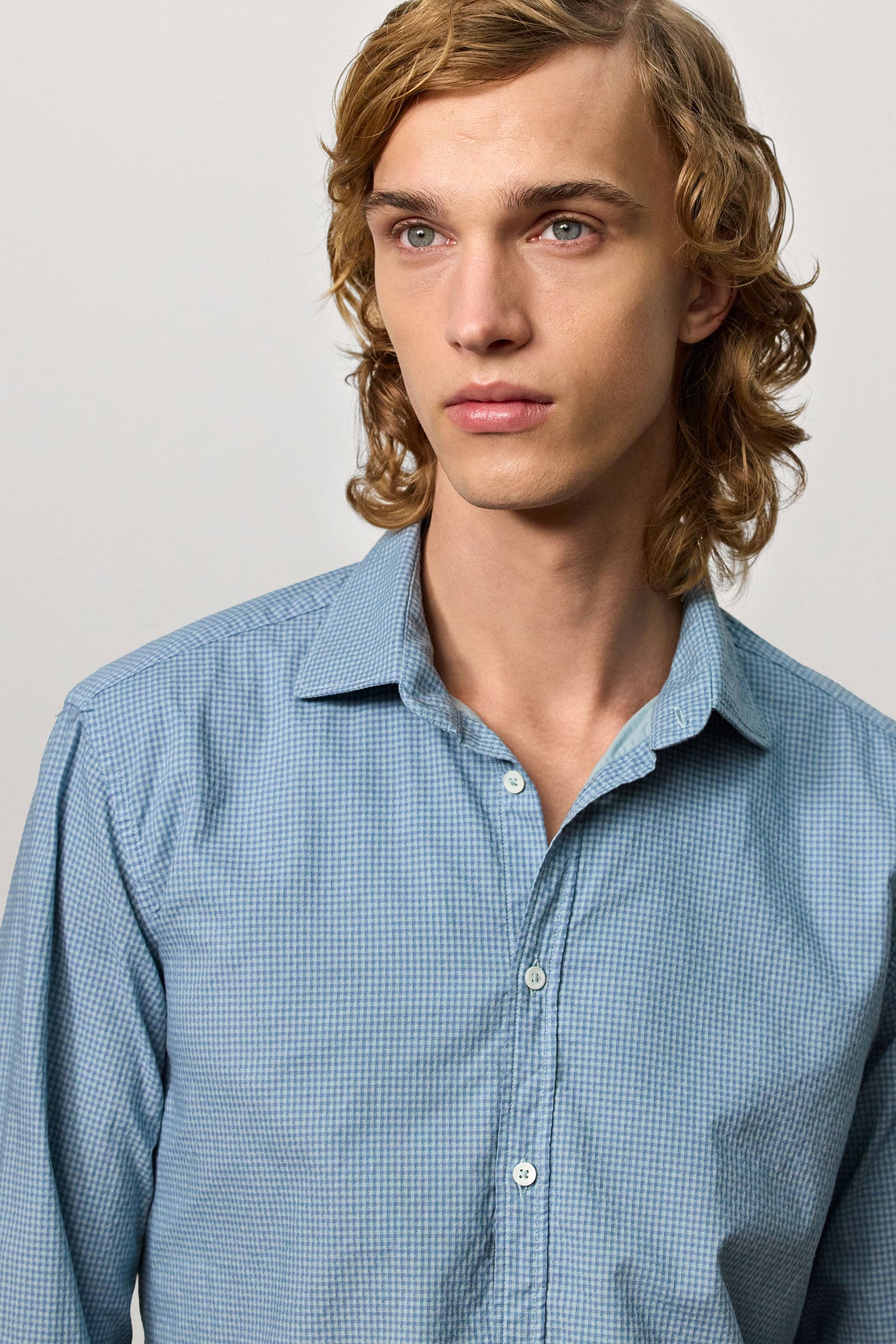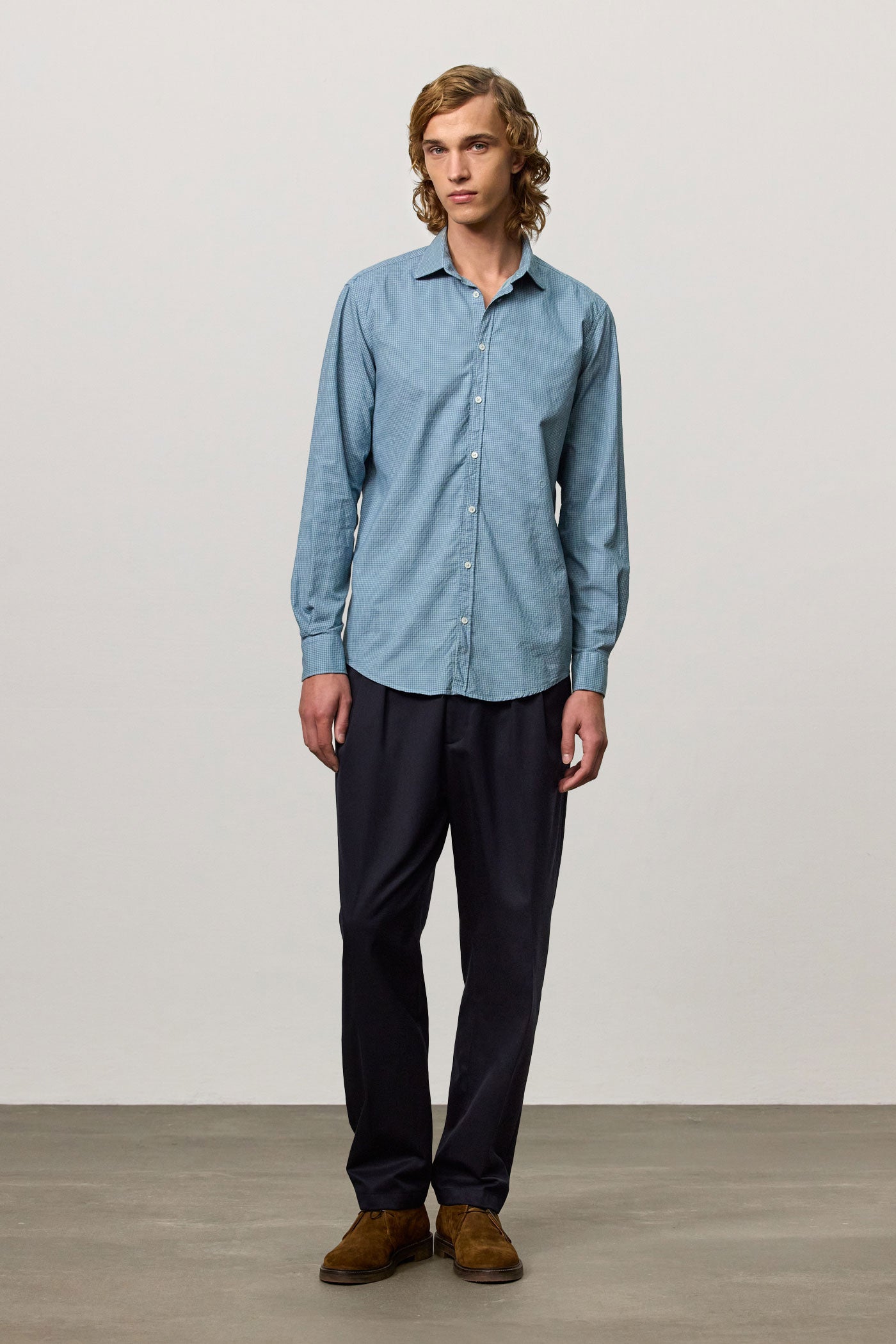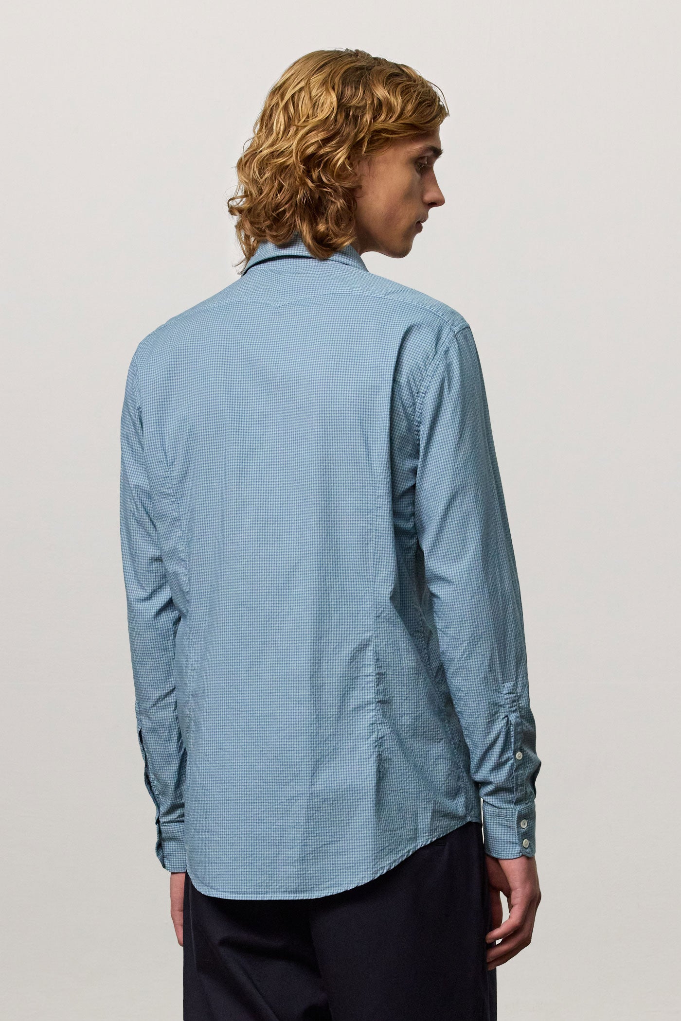 Soft collar shirt with rounded tips, front closure, detail of the inner bib in cotton voile, and shield embroidery for placing numbers, pointed back yoke, rounded bottom, classic fit. Made from micro check watercolor cotton. Made in Italy.