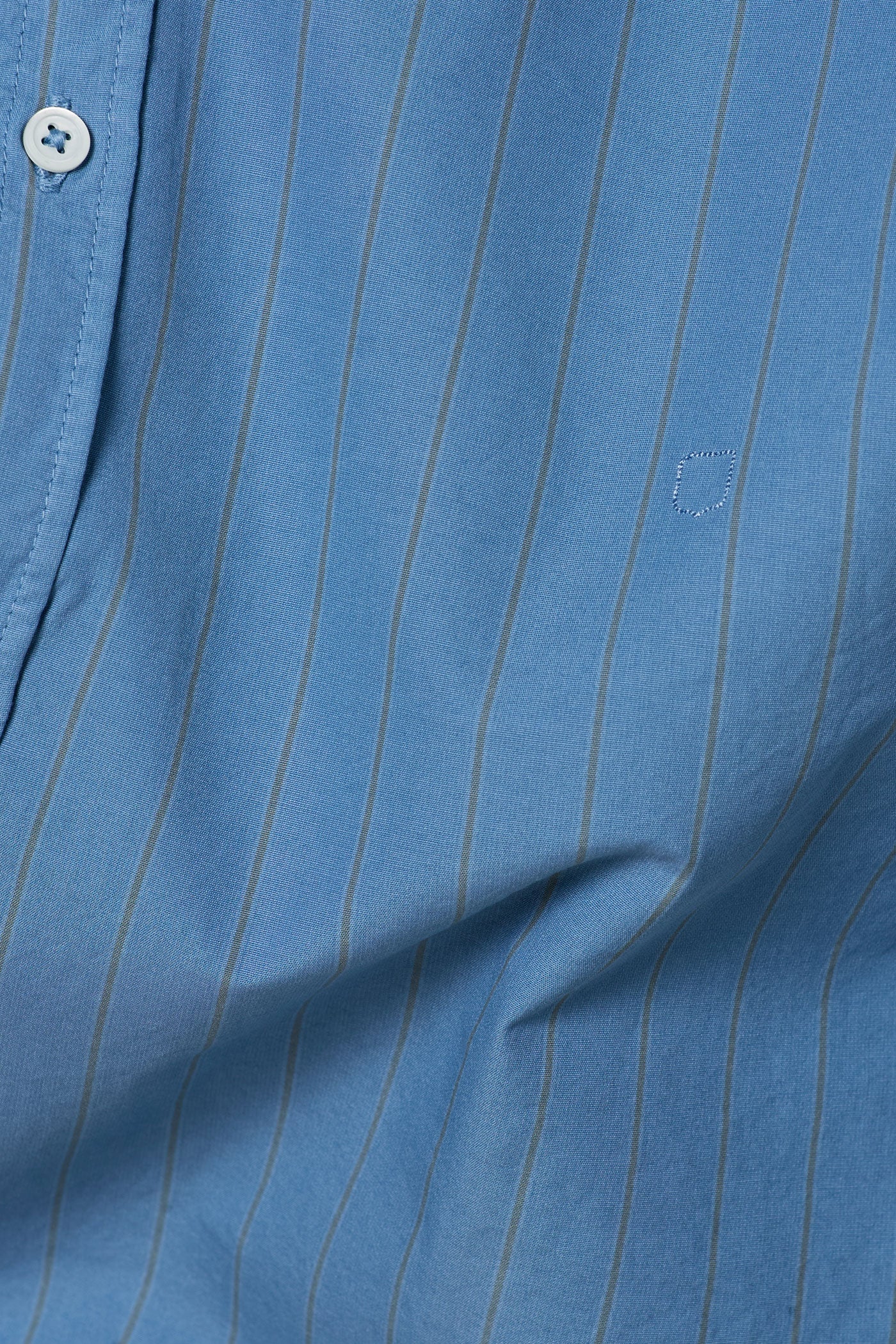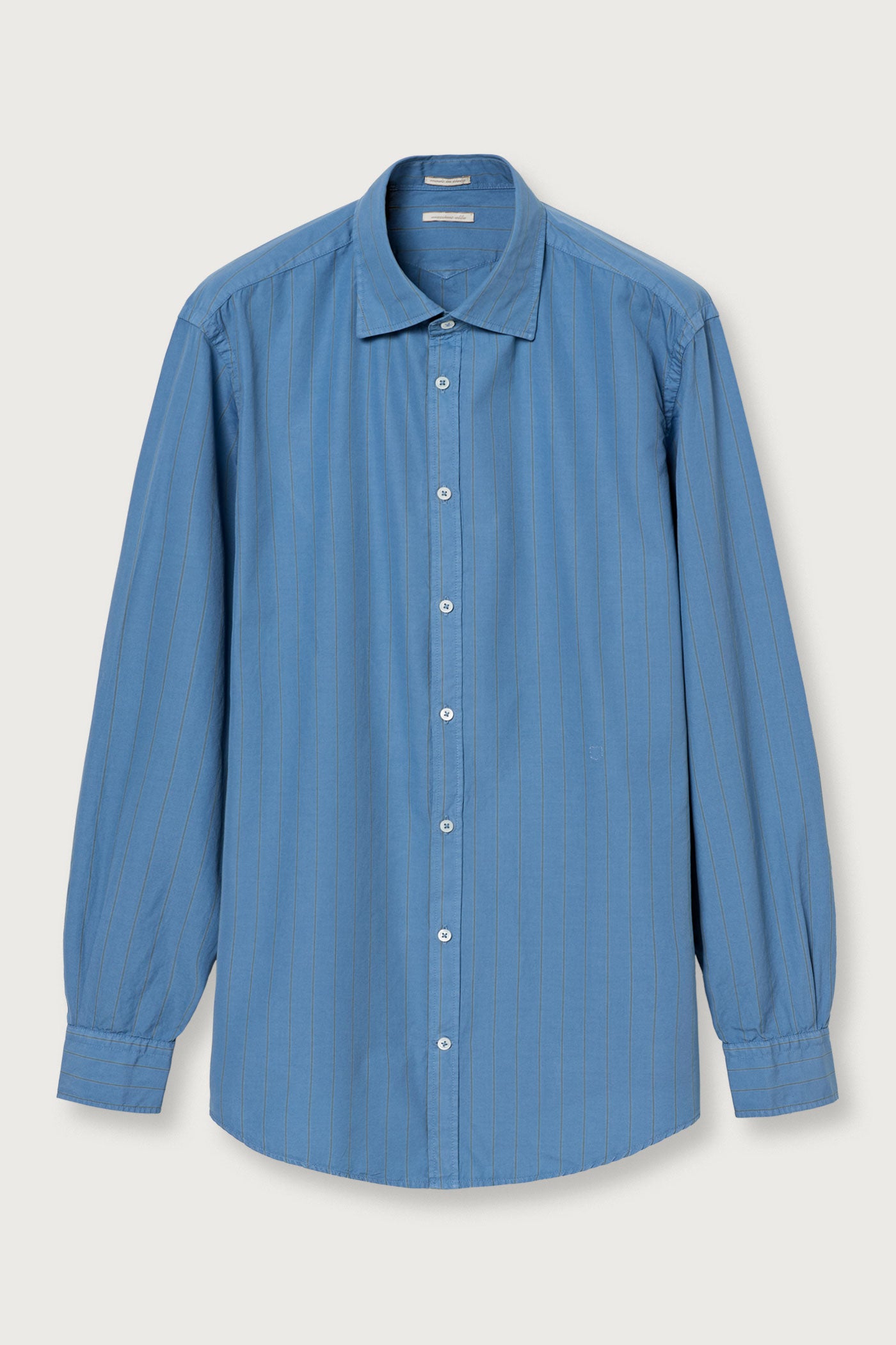 Regular-fit shirt with a pointed collar, classic soft front placket, and a cotton voilè inner bib. Made of striped watercolor cotton. Features custom badge embroidery for initials and a pointed rear yoke. Made in Italy.