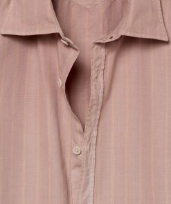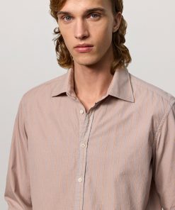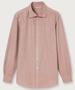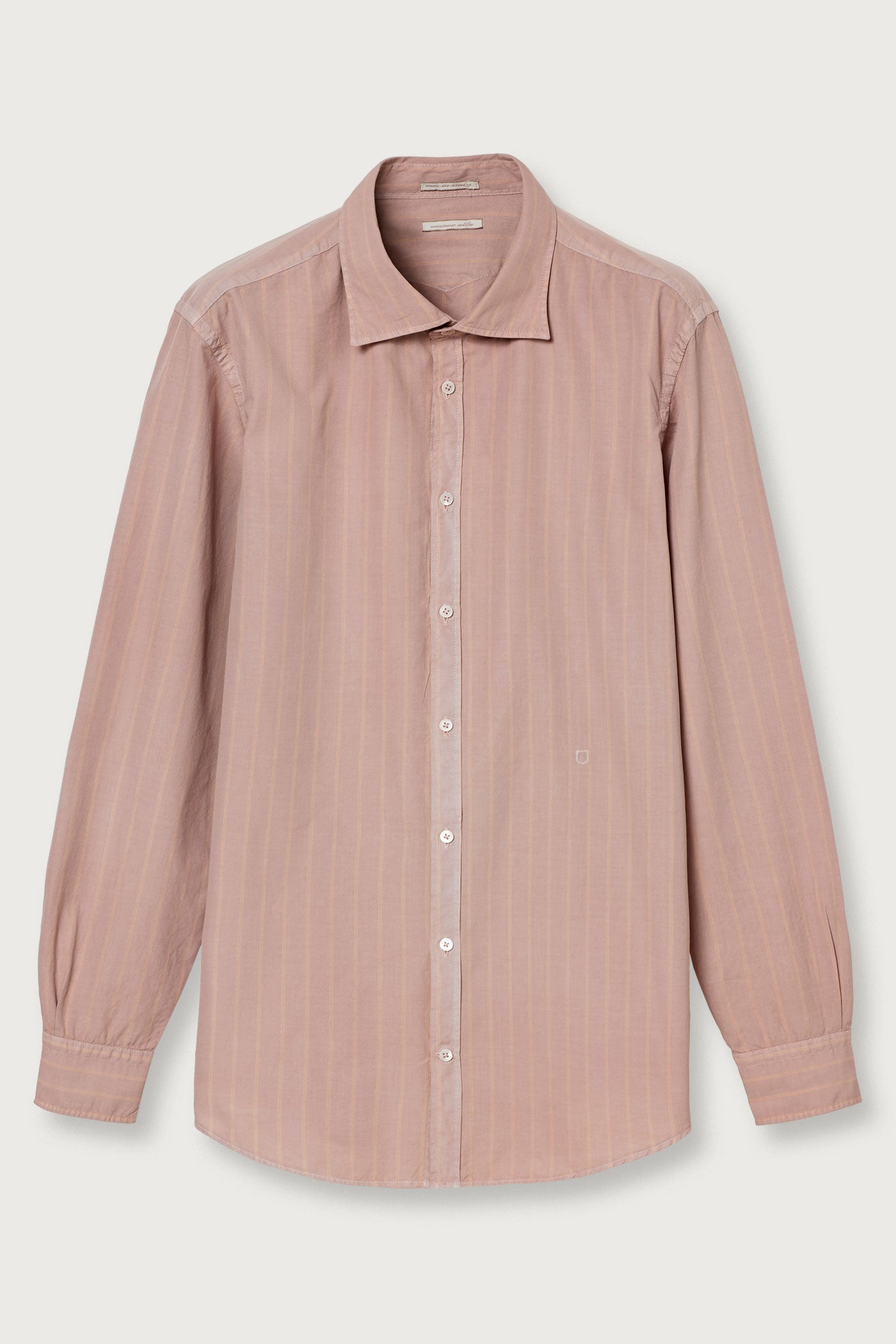 Regular-fit shirt with a pointed collar, classic soft front placket, and a cotton voilè inner bib. Made of striped watercolor cotton. Features custom badge embroidery for initials and a pointed rear yoke. Made in Italy.