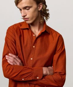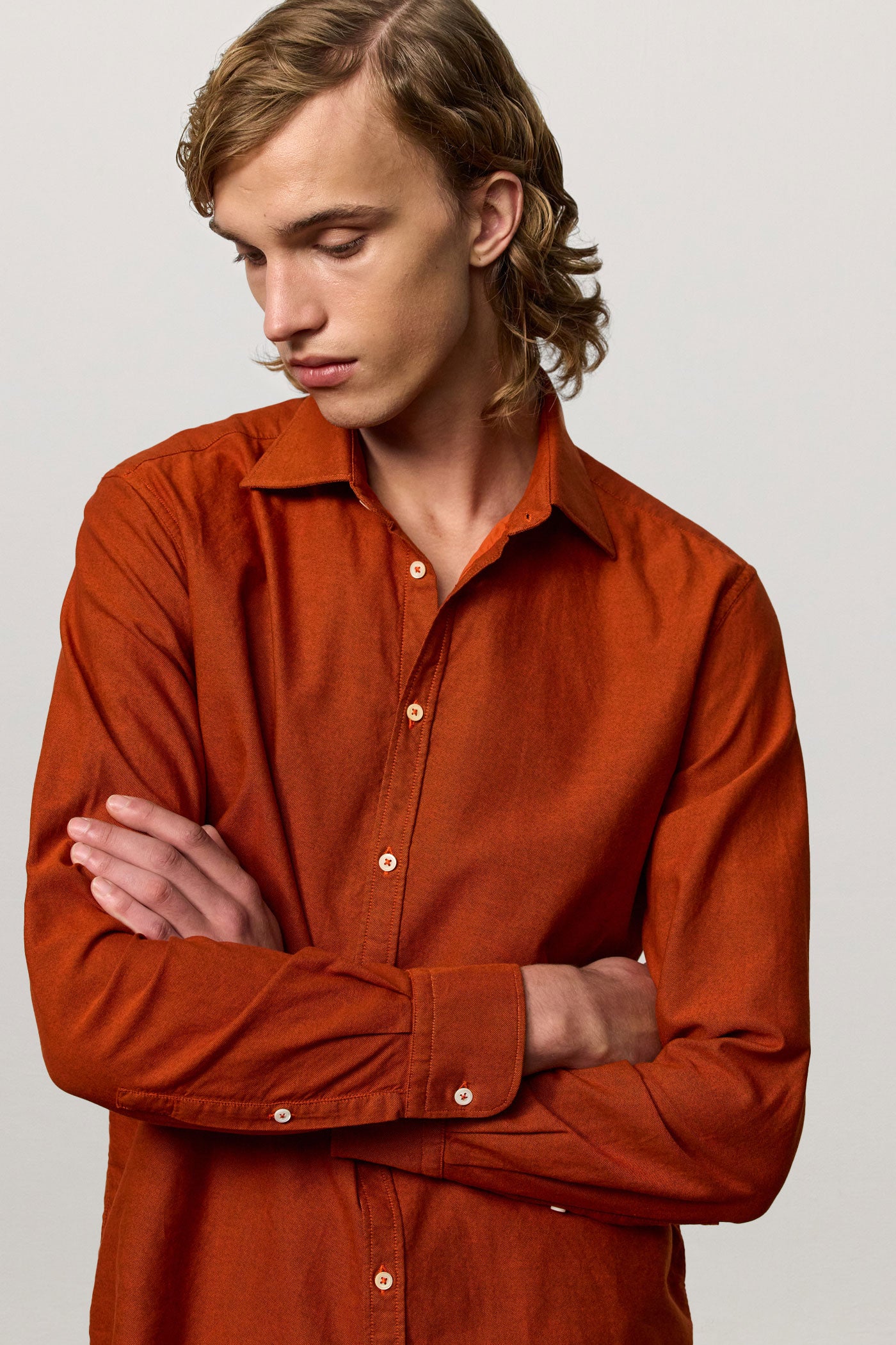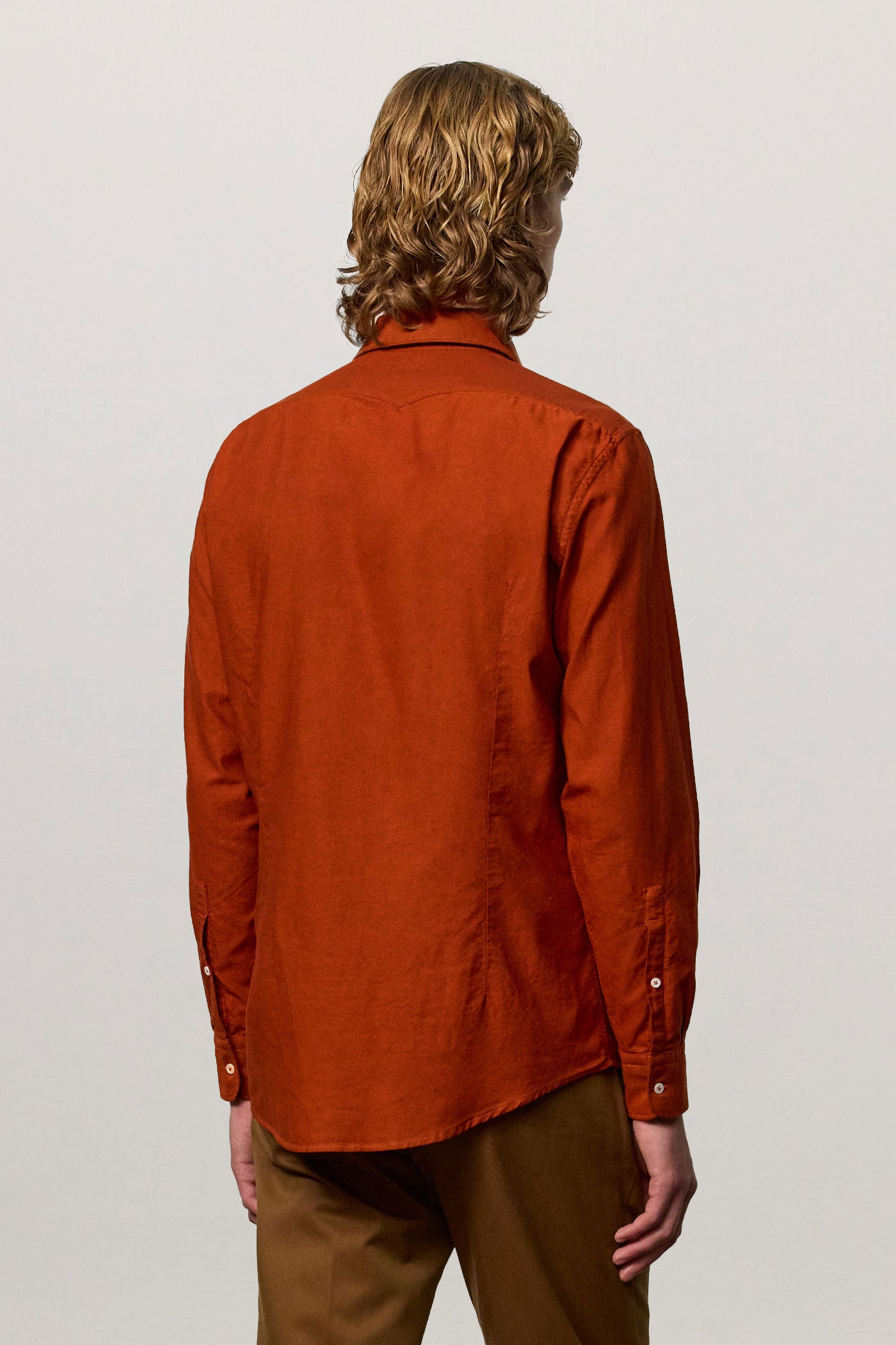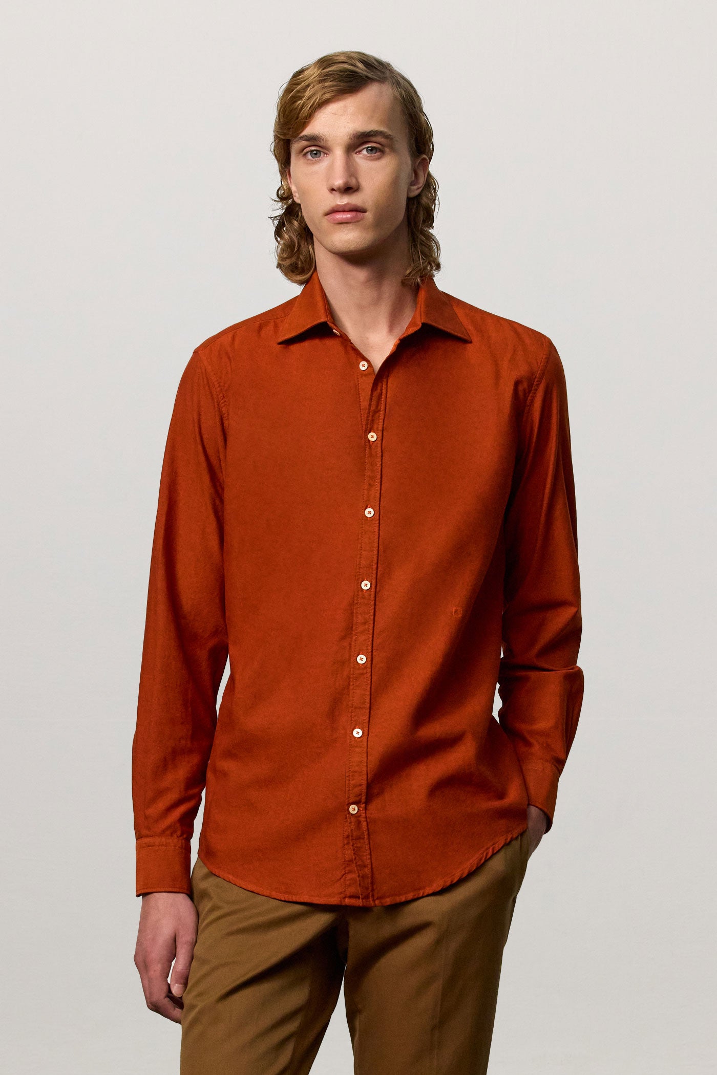 Regular-fit shirt with a pointed collar, classic soft front placket, and a cotton voilè inner bib. Made of watercolor oxford cotton. Features custom badge embroidery for initials and a pointed rear yoke. Made in Italy.