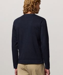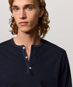 Long-sleeved t-shirt, guru collar, partial opening with three mother-of-pearl buttons, regular fit, made in lightweight organic cotton jersey. Made in Italy.