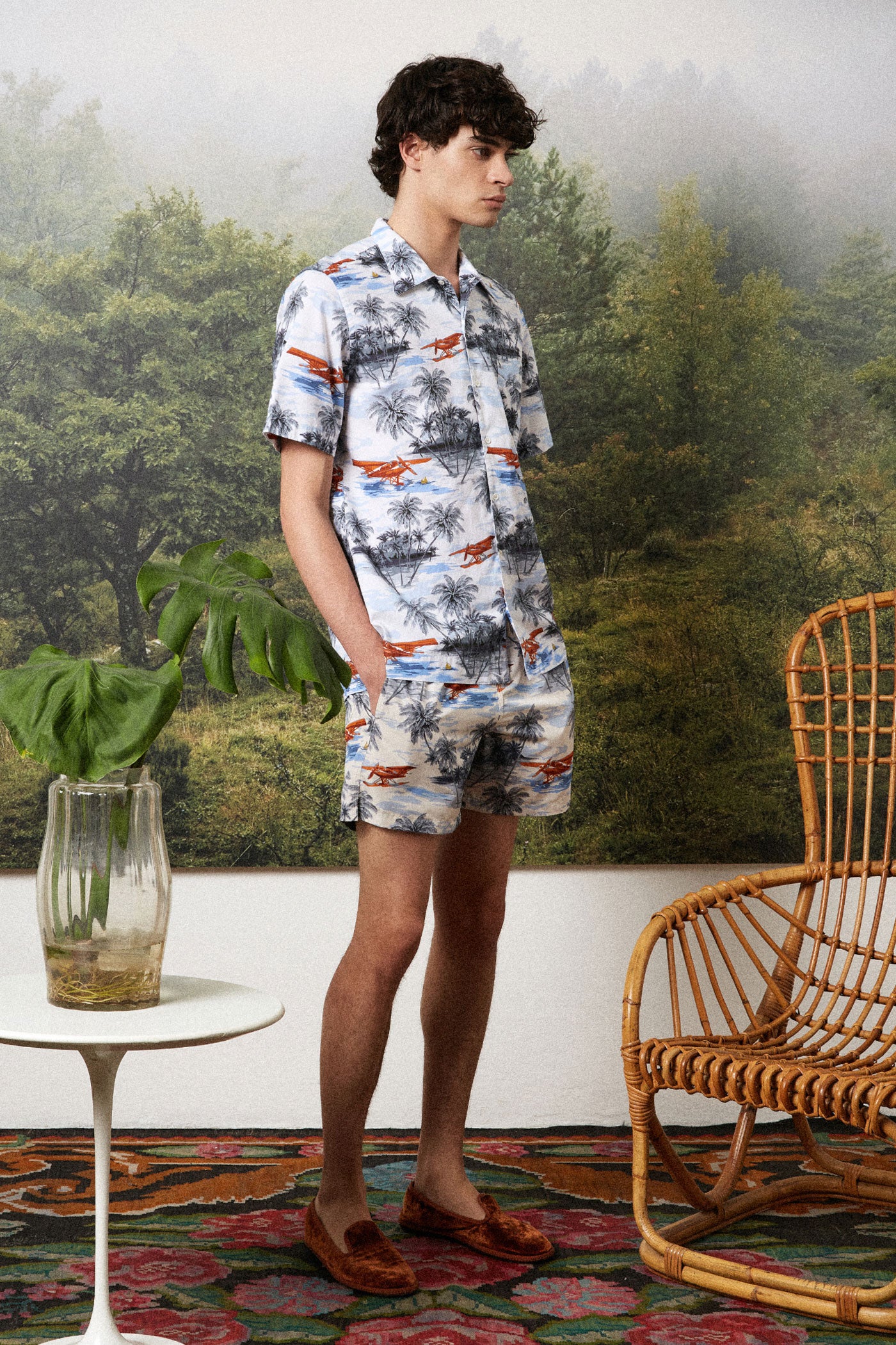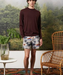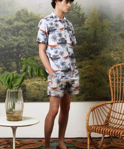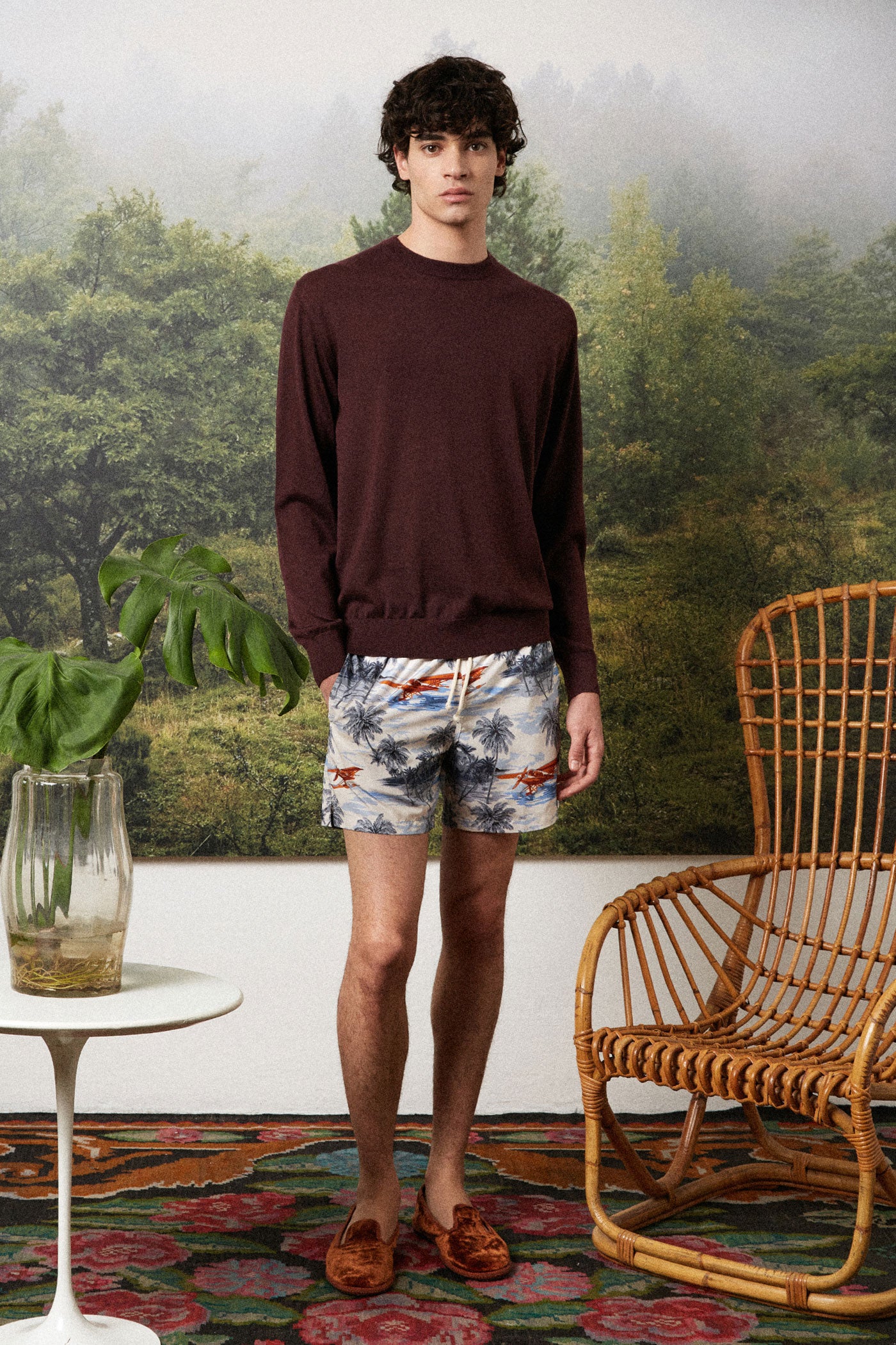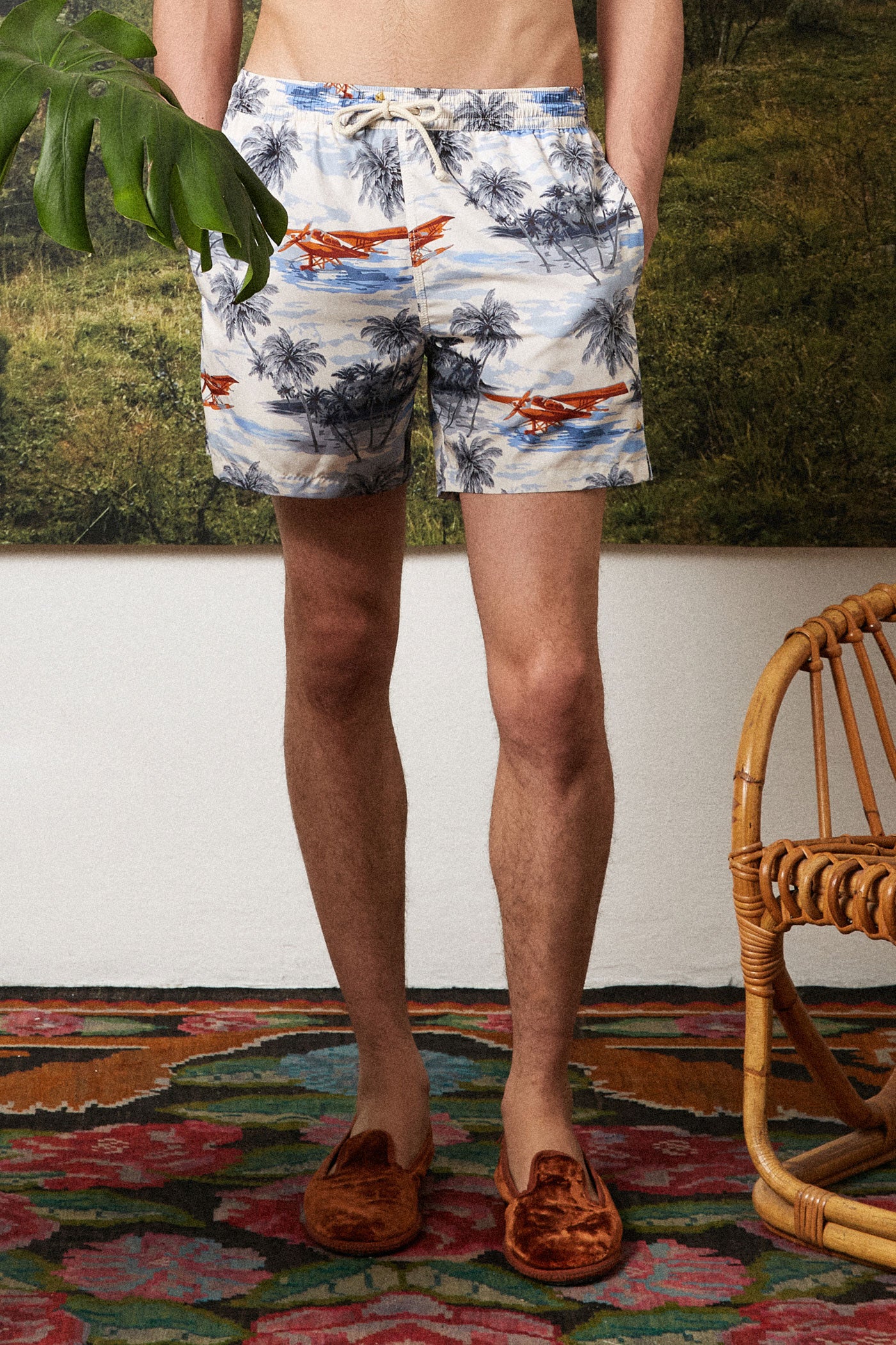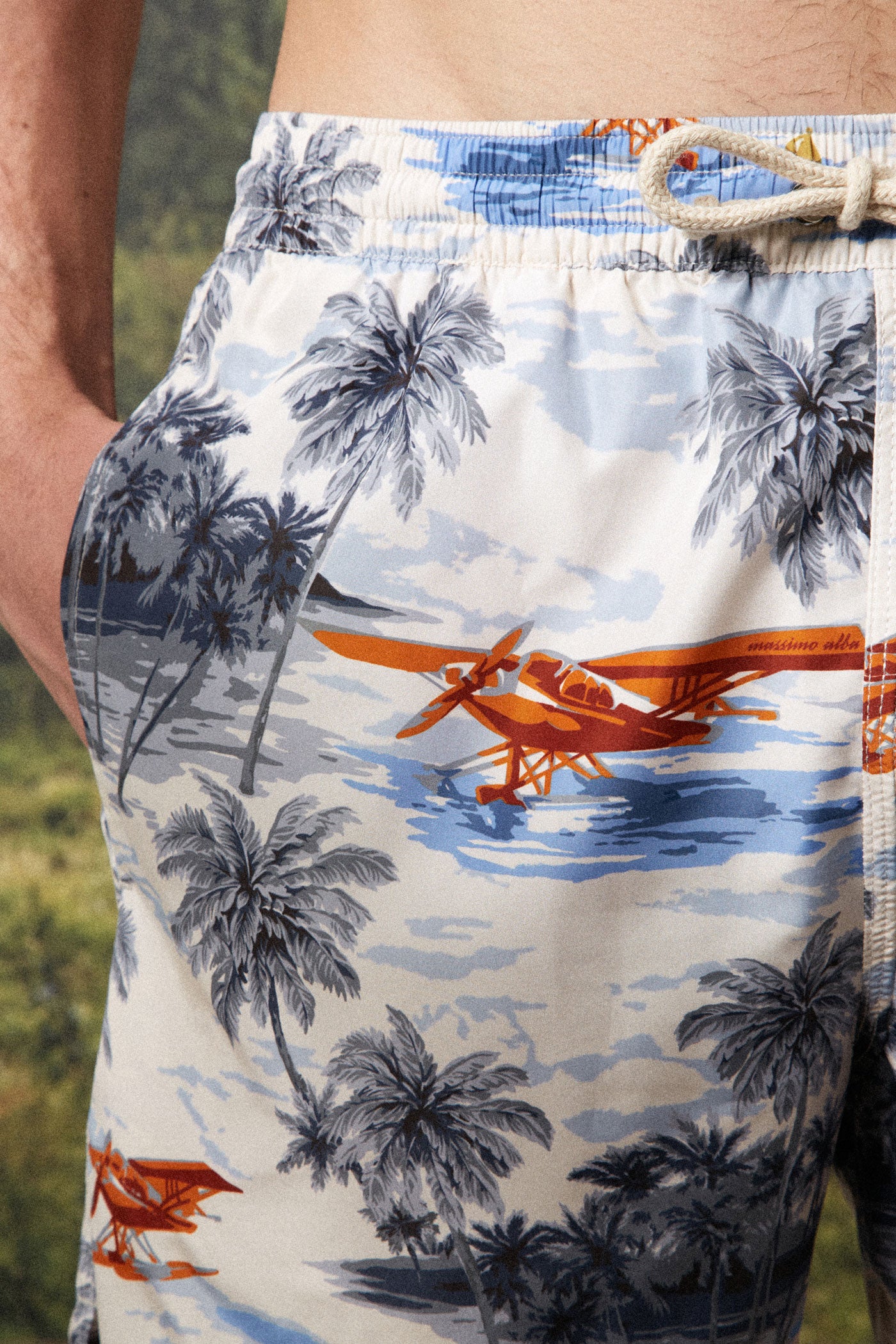 Classic fit swim shorts with drawstrings waistband, pockets and mesh slip lining. Made in two different tropical prints. Made in Italy.