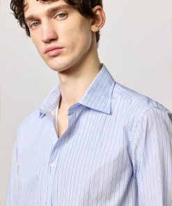 Shirt with pointed collar, front closure, cotton voile plastron detail and embroidered crest for numbering. Pointed back yoke with rounded hem. Regular fit. Crafted from yarn-dyed striped cotton poplin. Made in Italy.