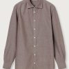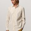 Shirt with pointed collar, front closure, cotton voile plastron detail and embroidered crest for numbering. Pointed back yoke with rounded hem. Regular fit. Crafted from yarn-dyed striped cotton poplin. Made in Italy.