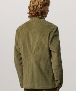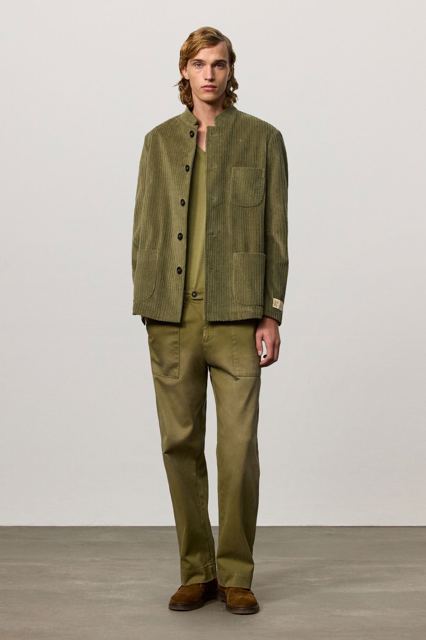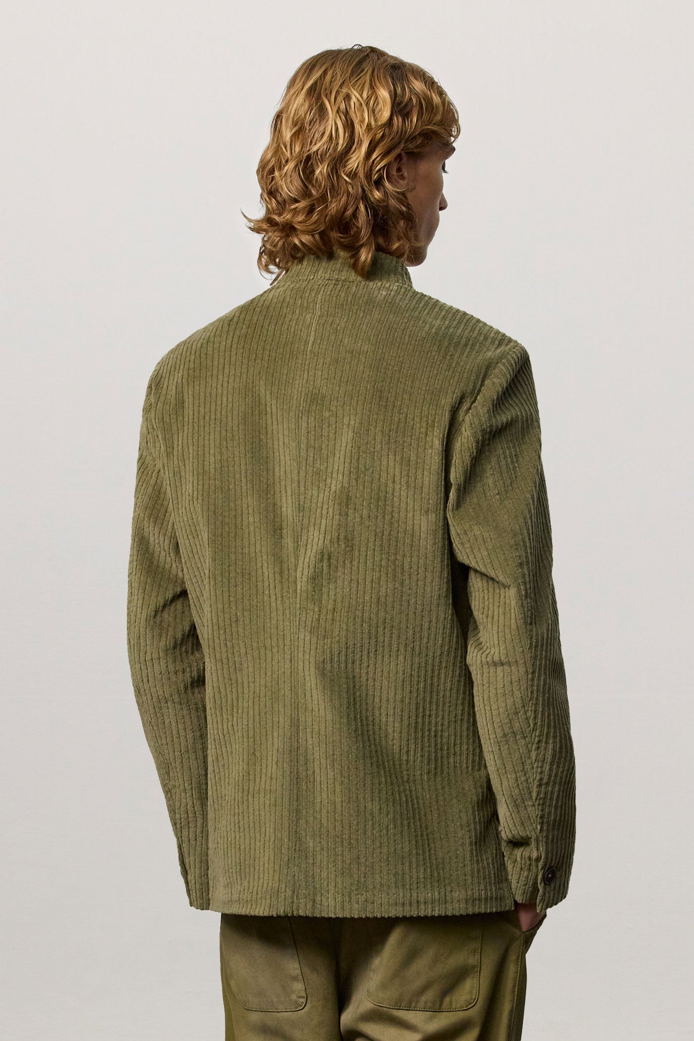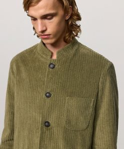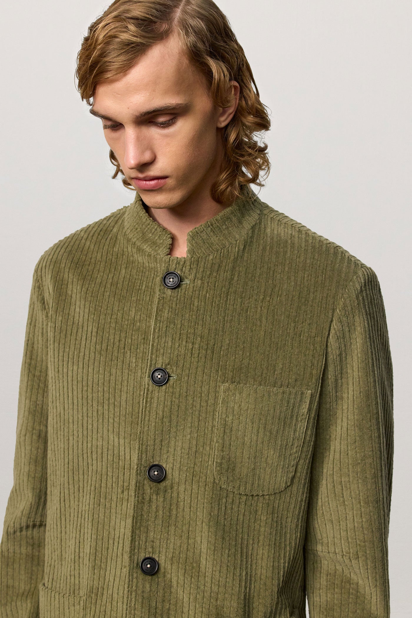 Regular-fit single-breasted jacket with a stand-up collar, patch pockets, side slits, and five horn buttons. Made in stretch cotton corduroy. Made in Italy.