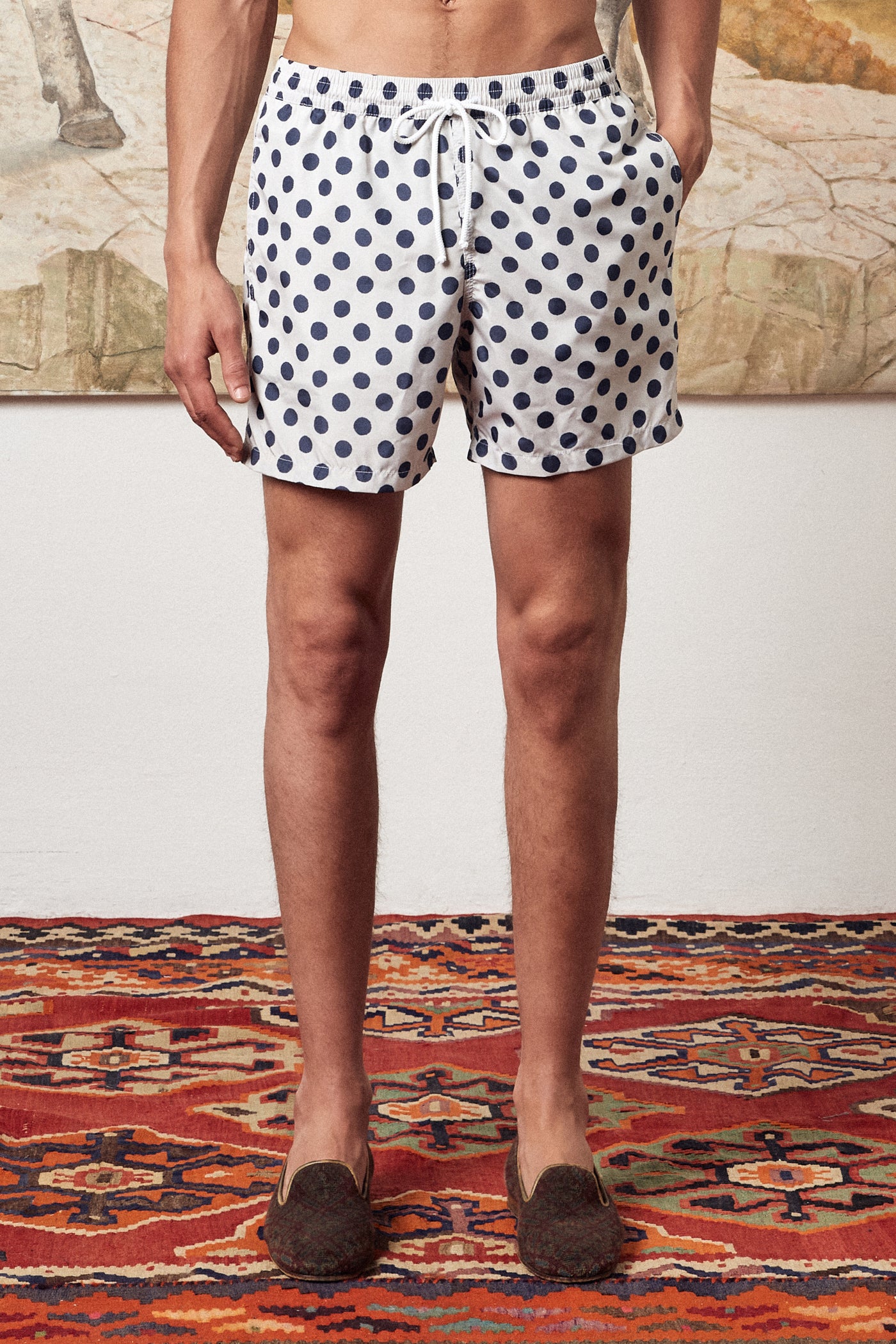 Classic fit swim shorts with drawstrings waistband, pockets and mesh slip lining.Made in an exclusive pois print. Made in Italy.