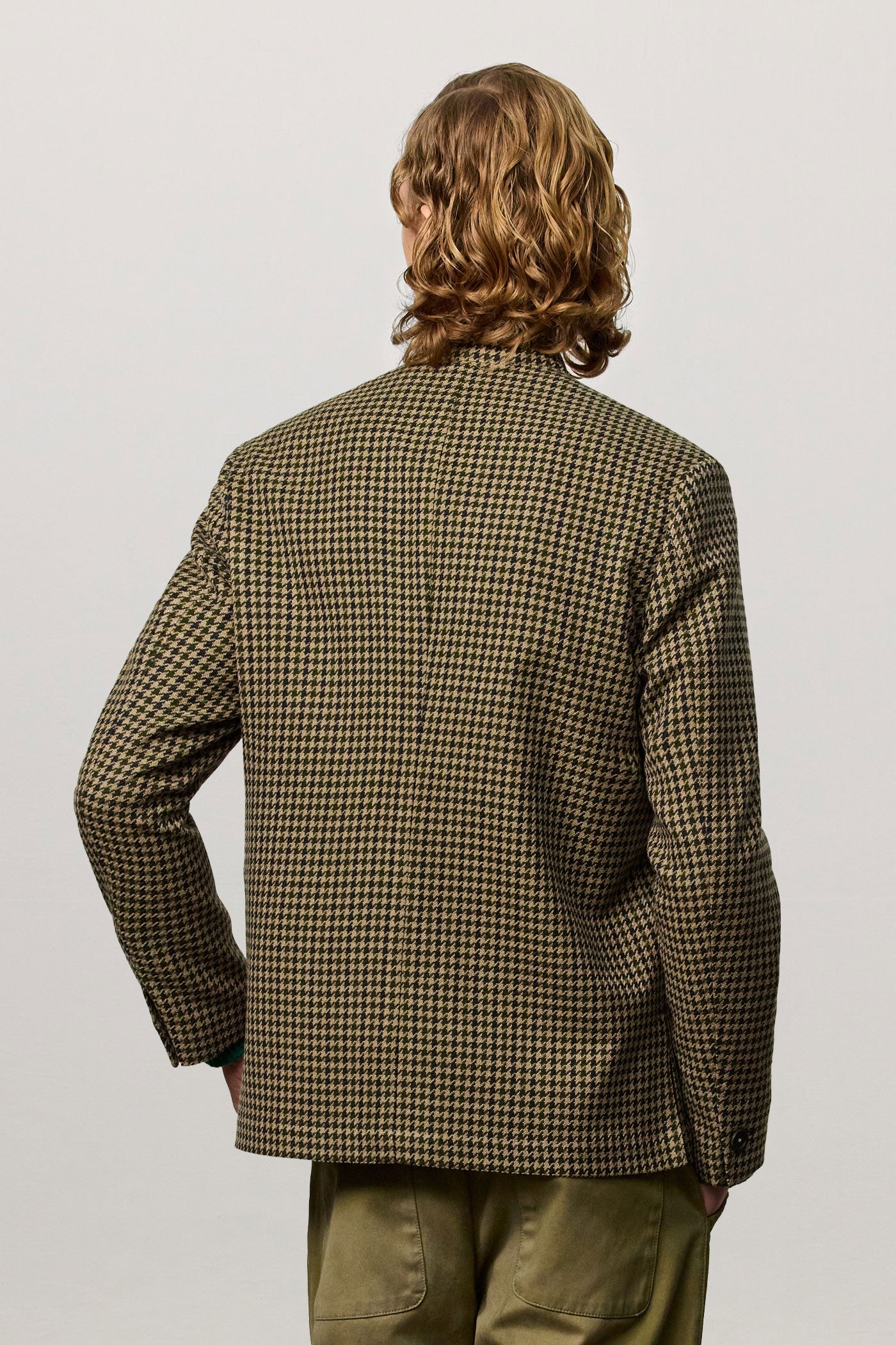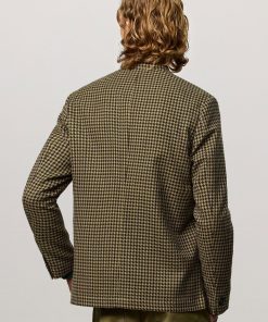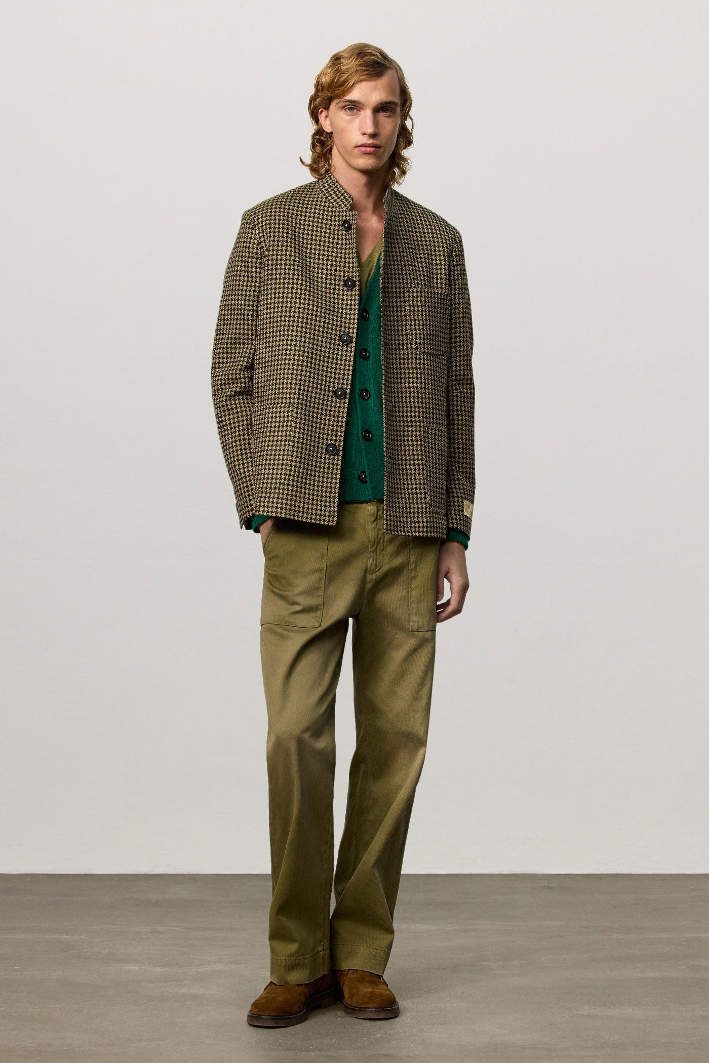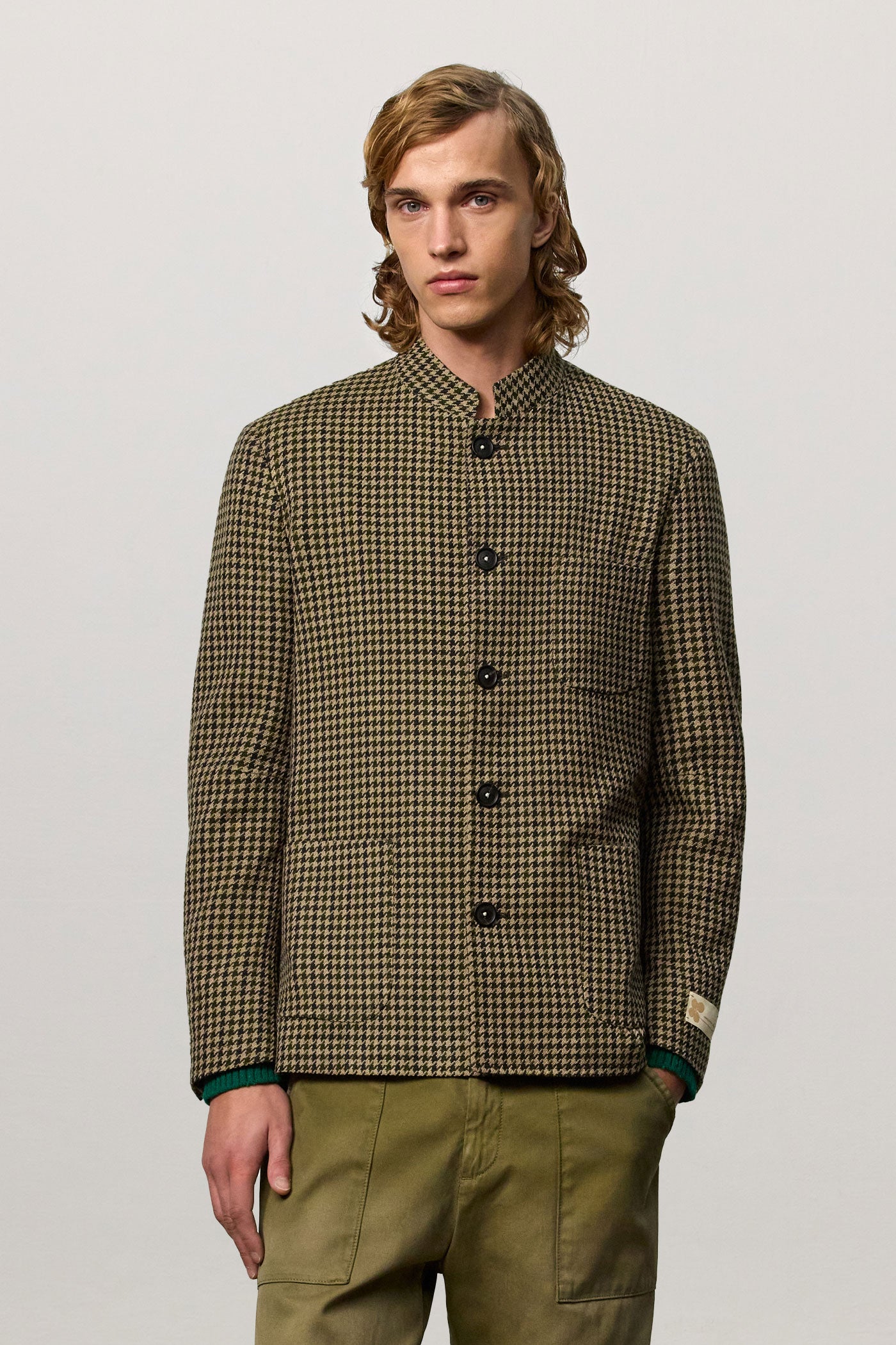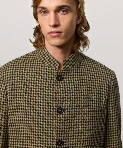 Regular-fit single-breasted jacket with a stand-up collar, patch pockets, side slits, and five horn buttons. Made in pied-de-poule fabric in virgin wool and cotton. Made in Italy.