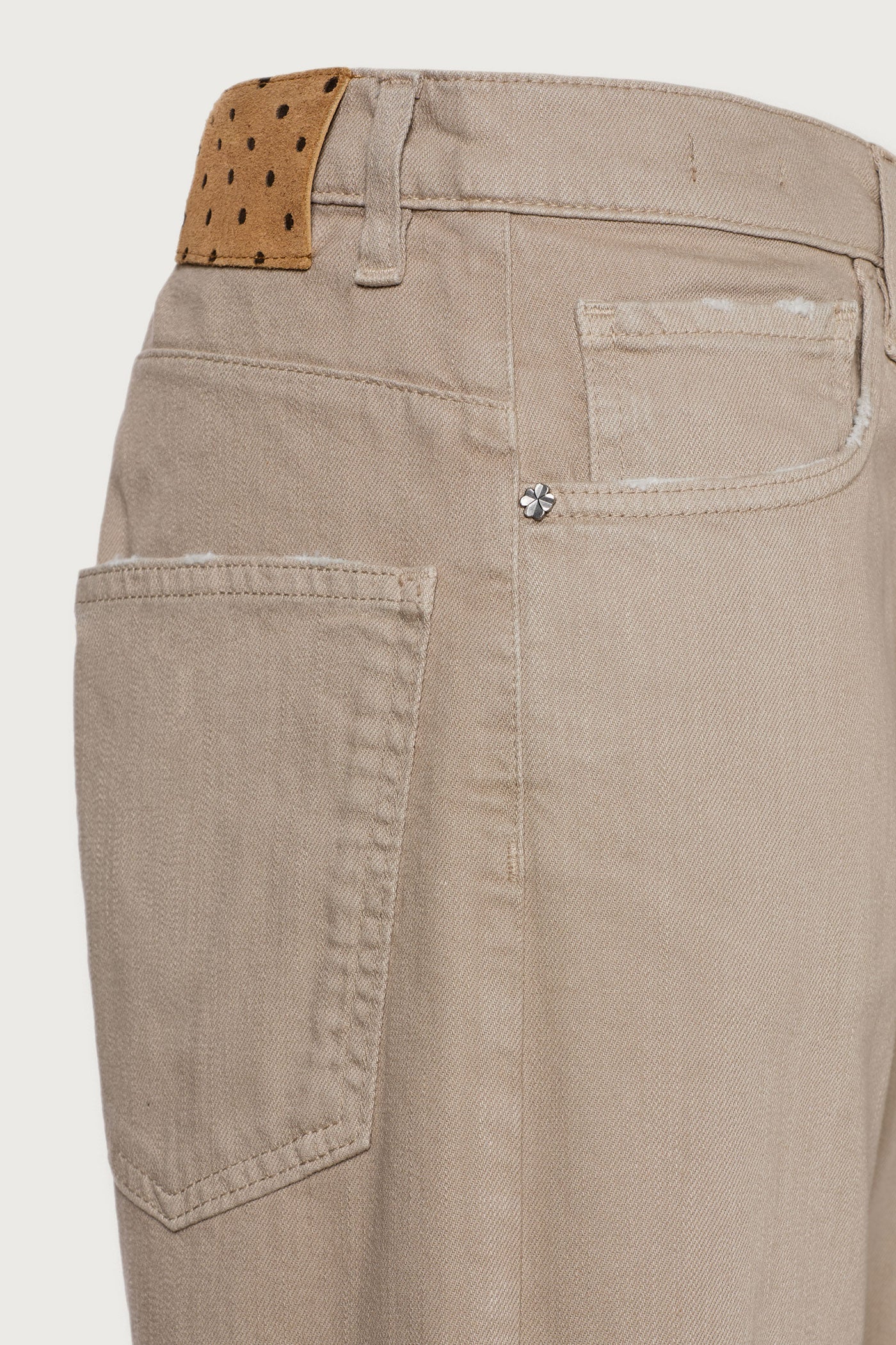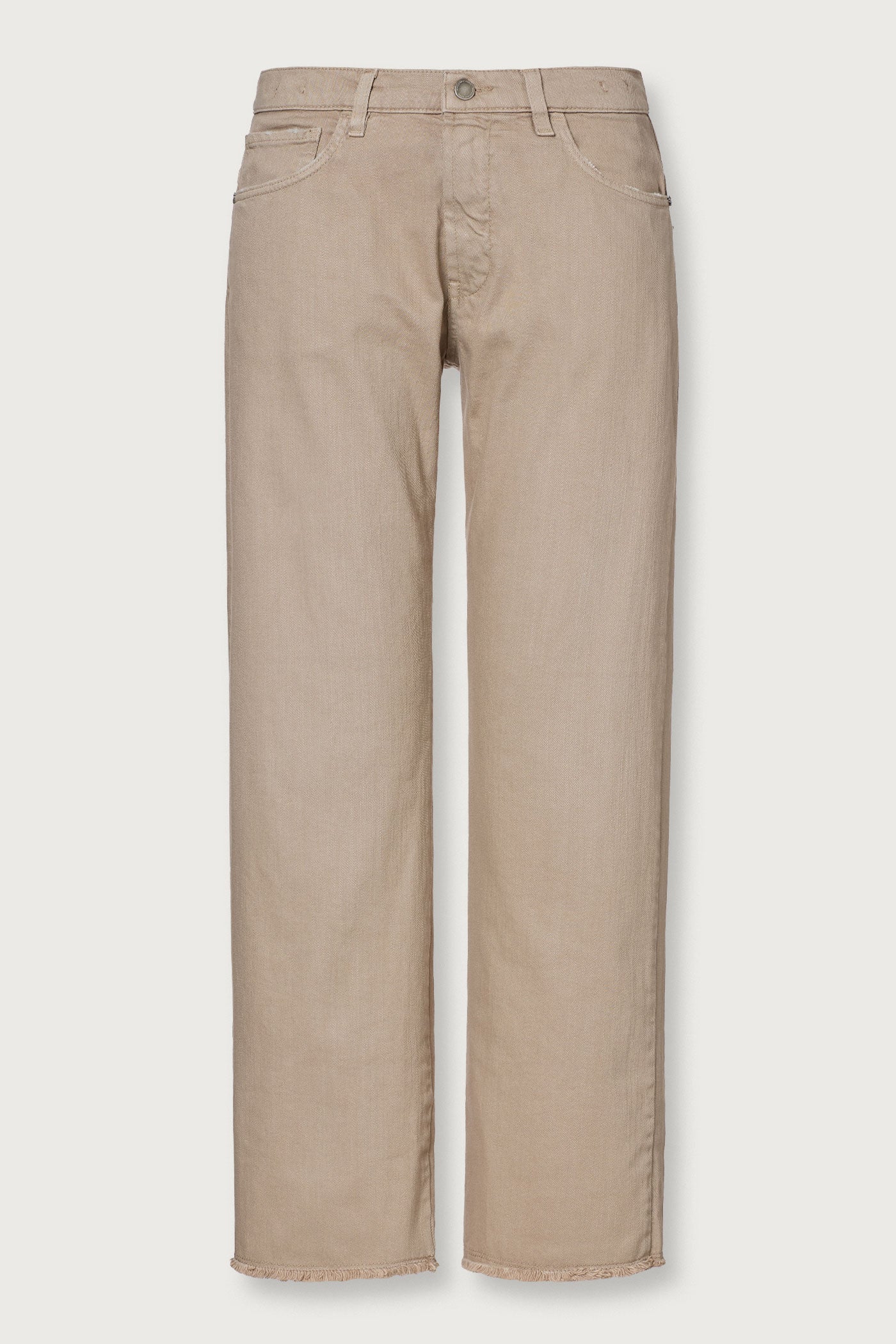 Loose-fit five-pocket boyfriend trousers, straight cut, ankle length with frayed hems. Made from slub bull-weave fabric in comfort cotton. Made in Italy.