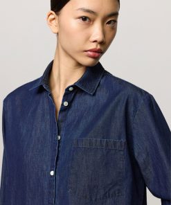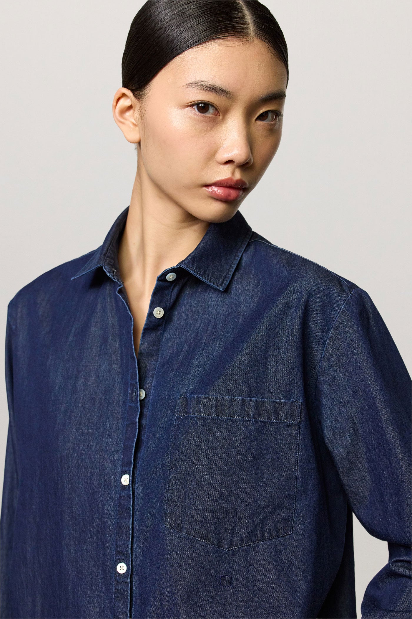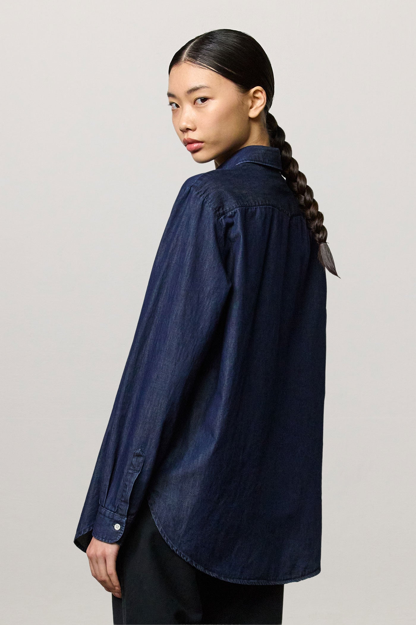 Shirt with classic collar, chest pocket, rounded collar stand and small embroidered crest on the front for adding initials. Crafted from light indigo cotton denim. Made in Italy.