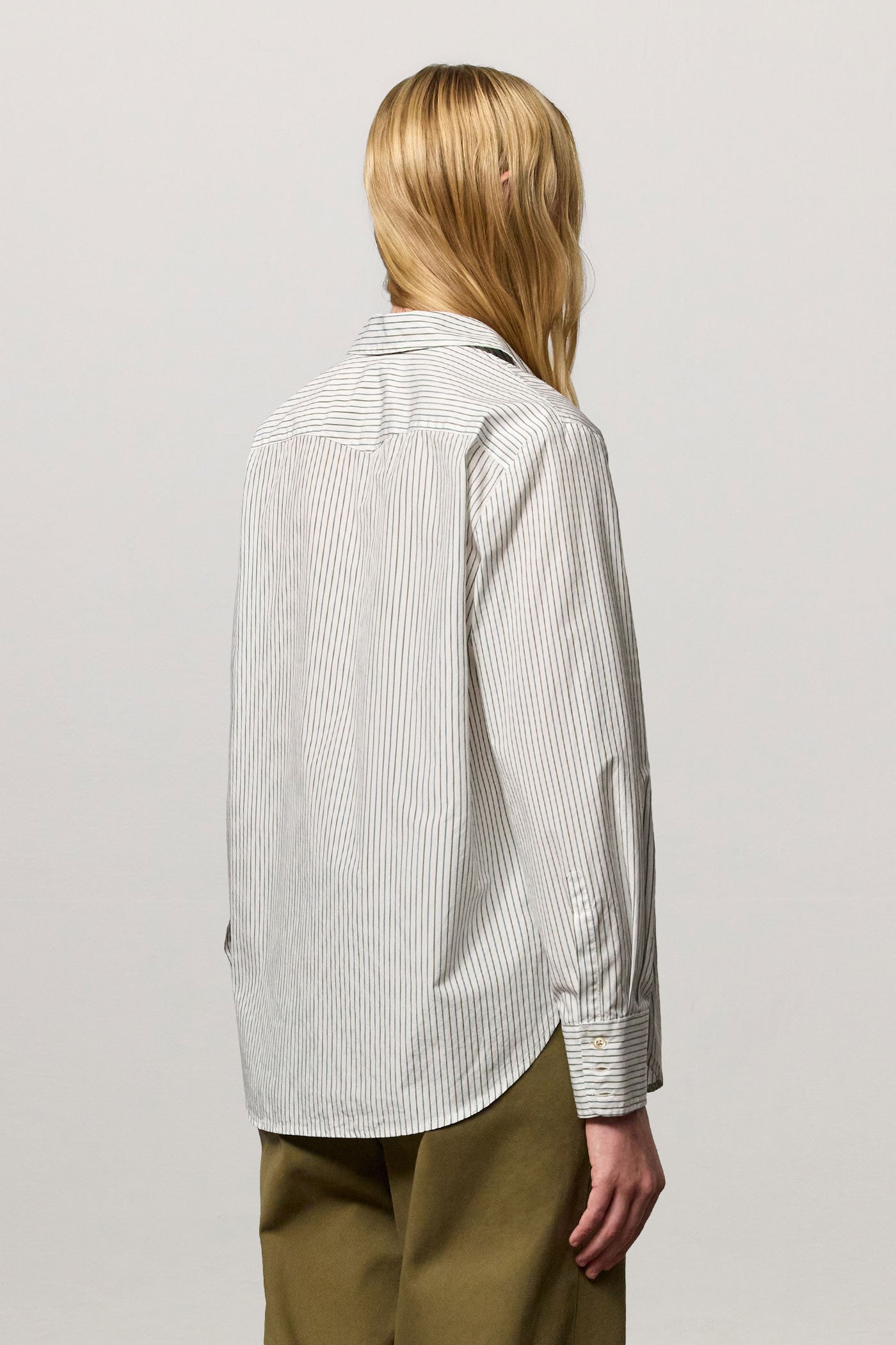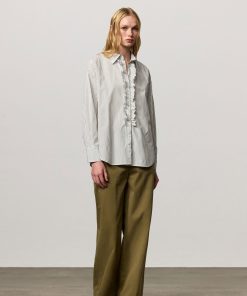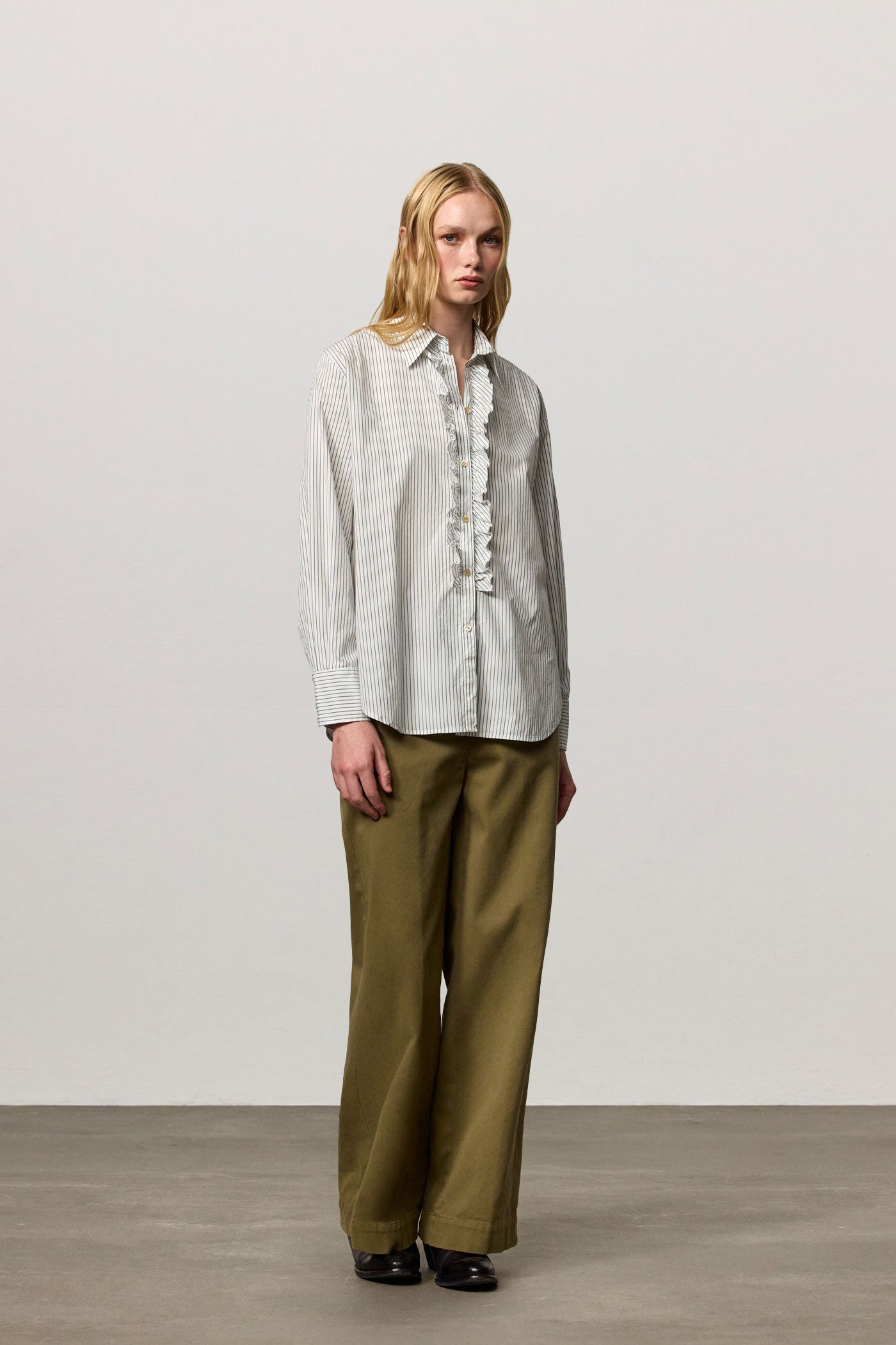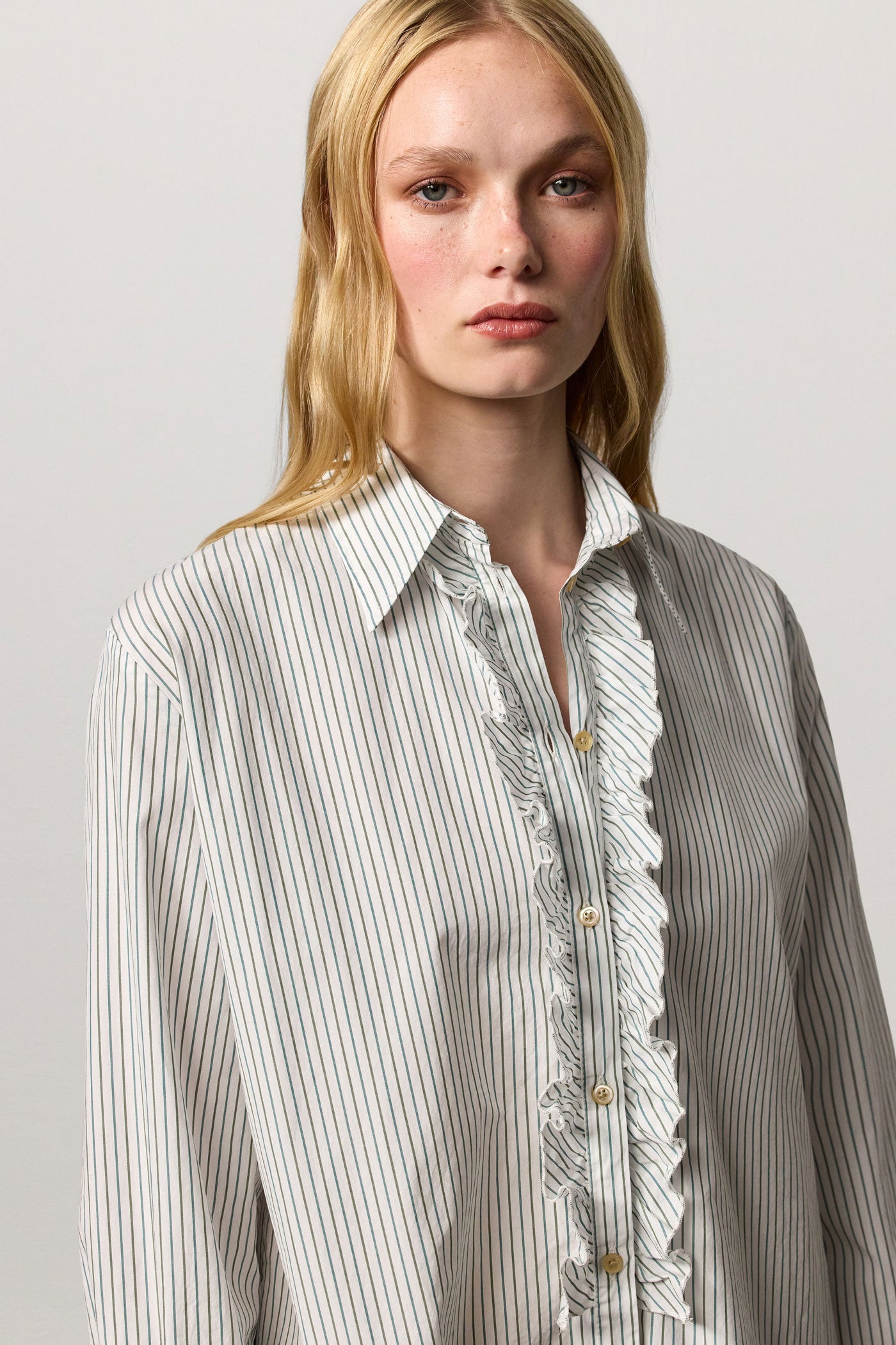 Comfort shirt with front ruffle and pointed rear yoke. Made of cotton. Made in Italy.