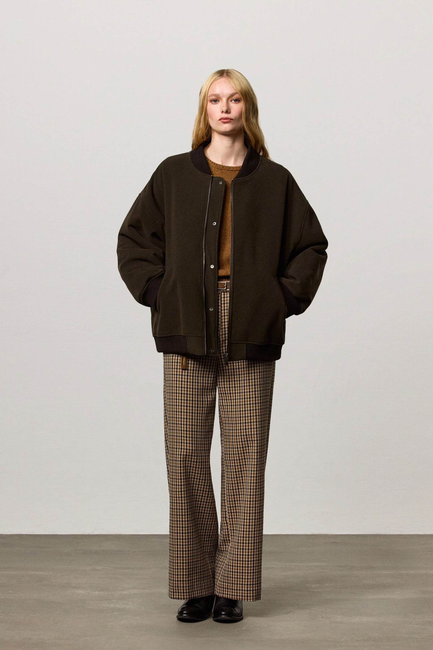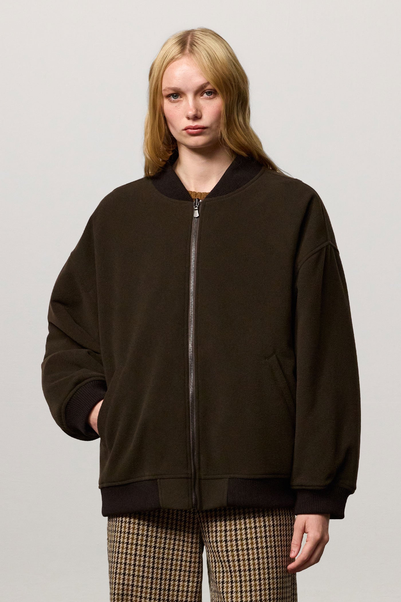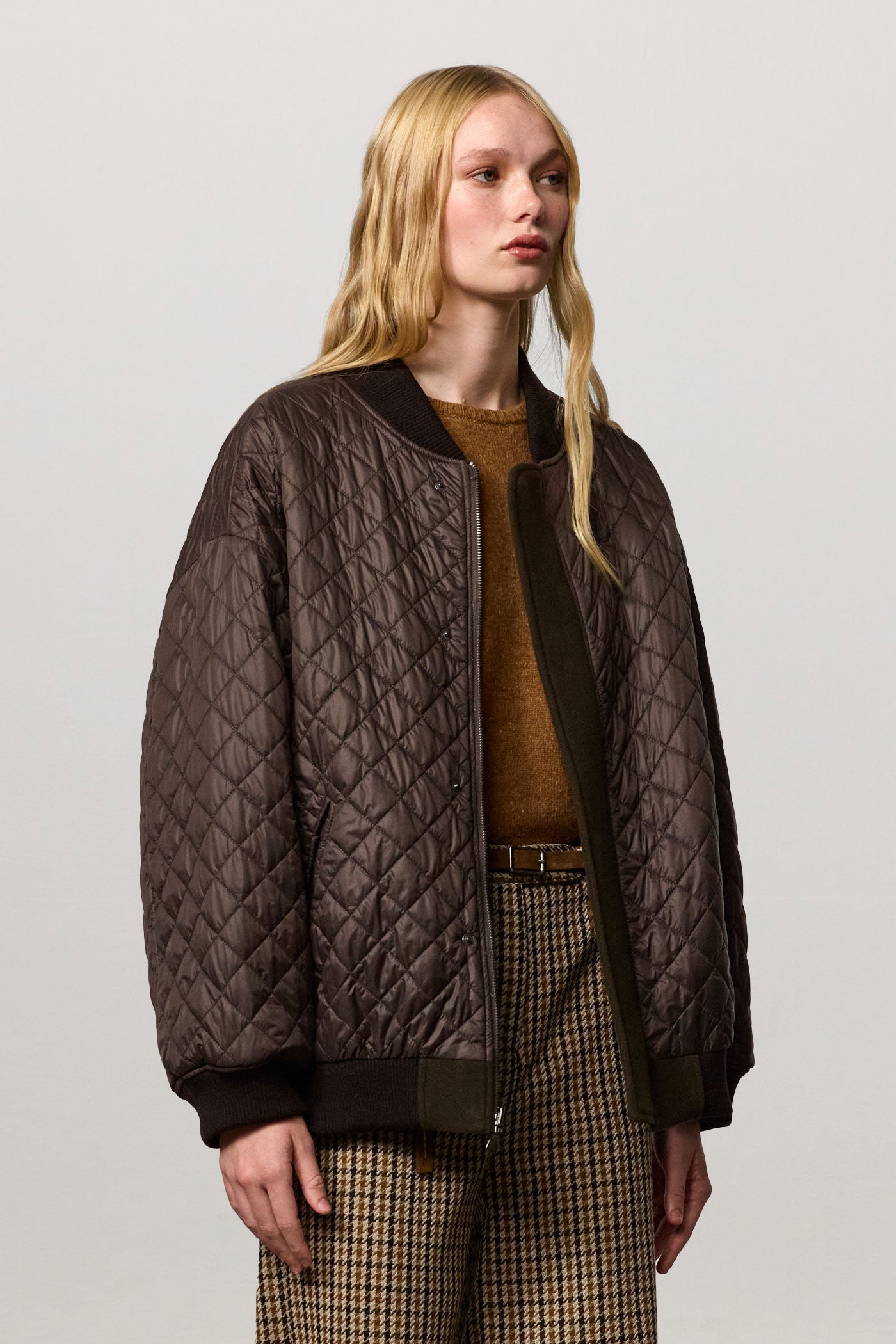 Reversible padded bomber jacket with a relaxed fit, featuring a front zip closure and raglan sleeves. It has two welt pockets on both sides. One side is crafted in compact virgin wool fabric, while the other side is quilted for extra warmth and style versatility. The jacket is finished with ribbed edges for a comfortable and snug fit. Made in Italy.