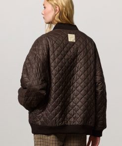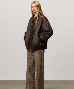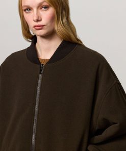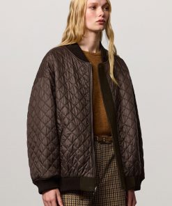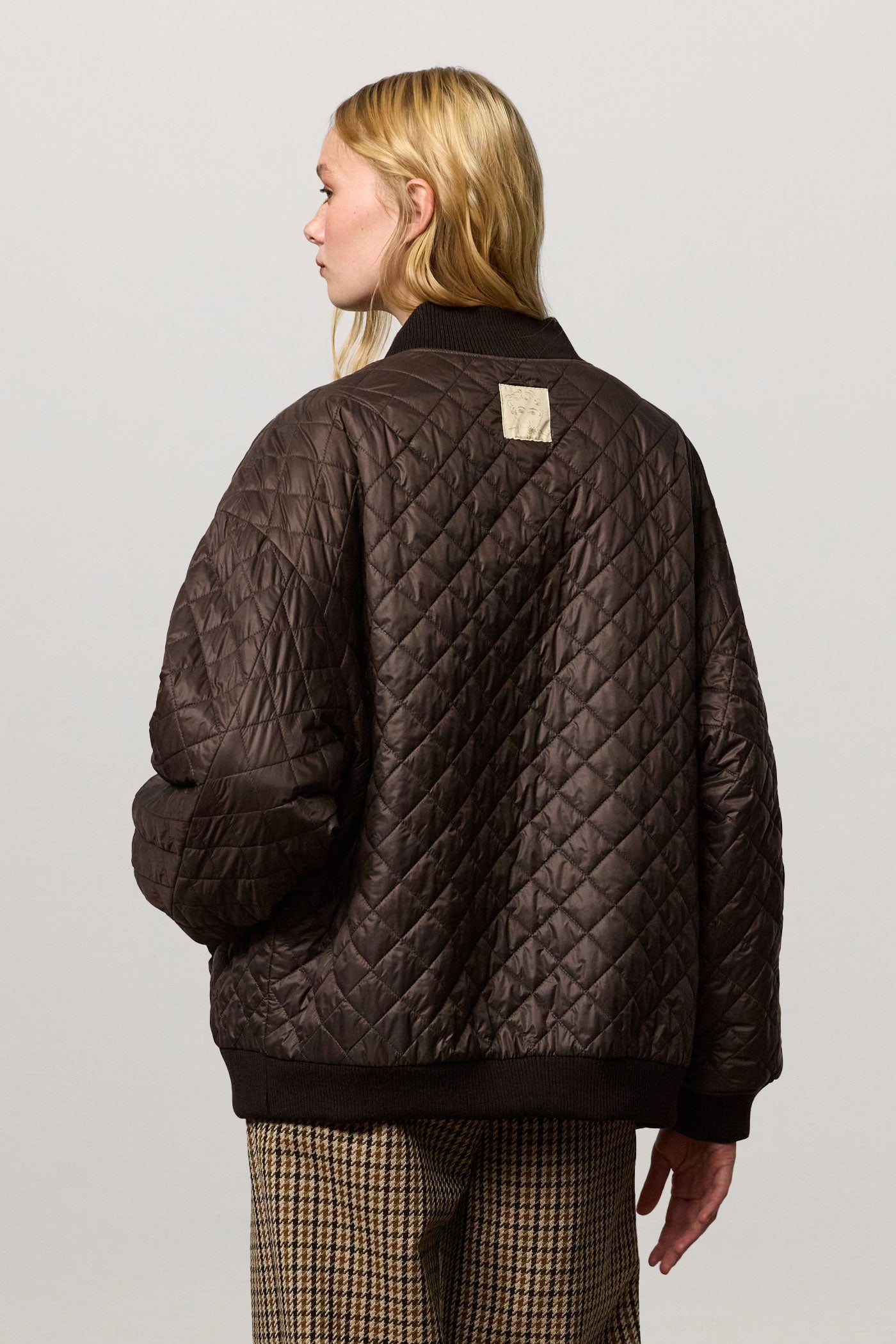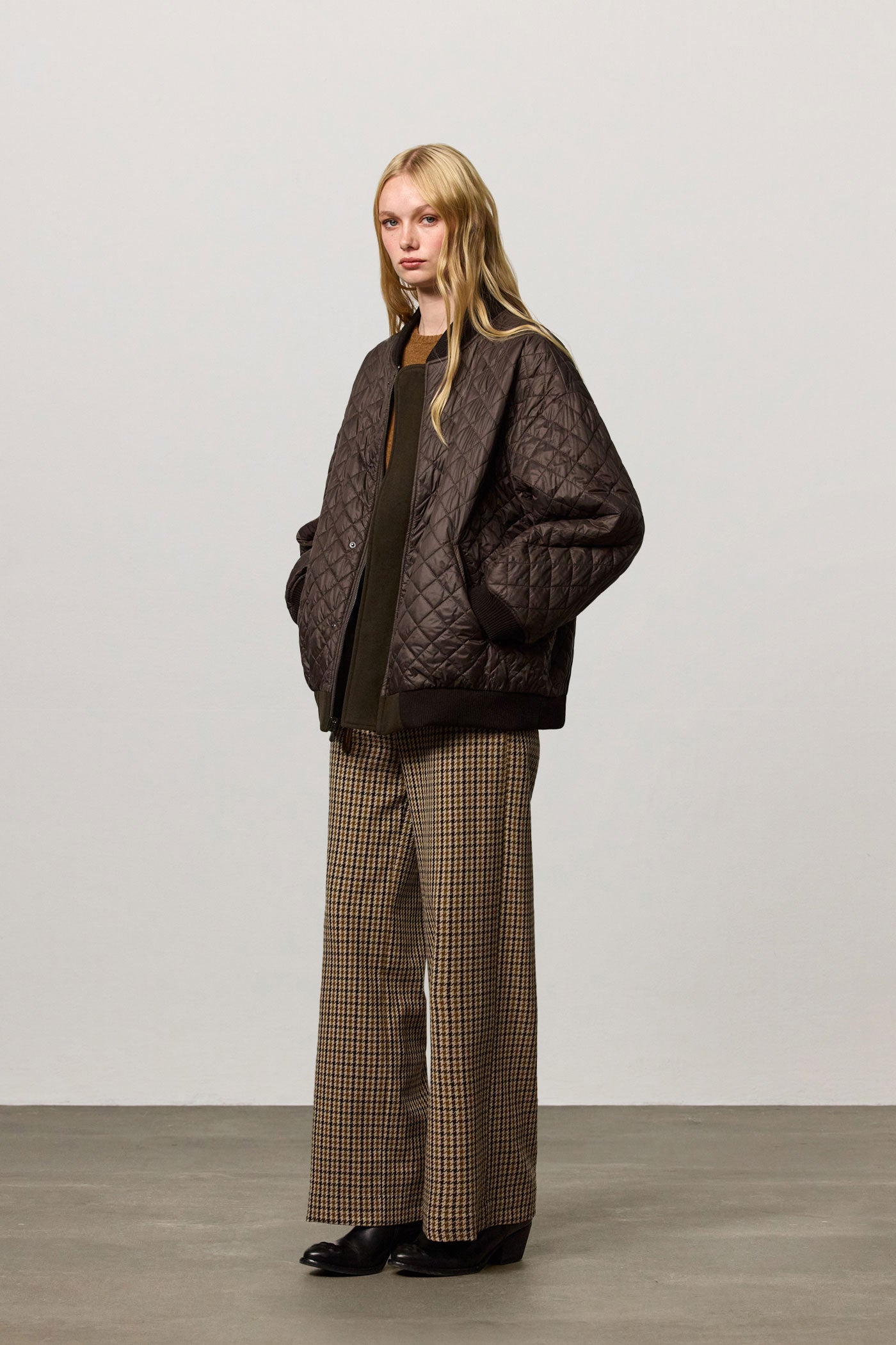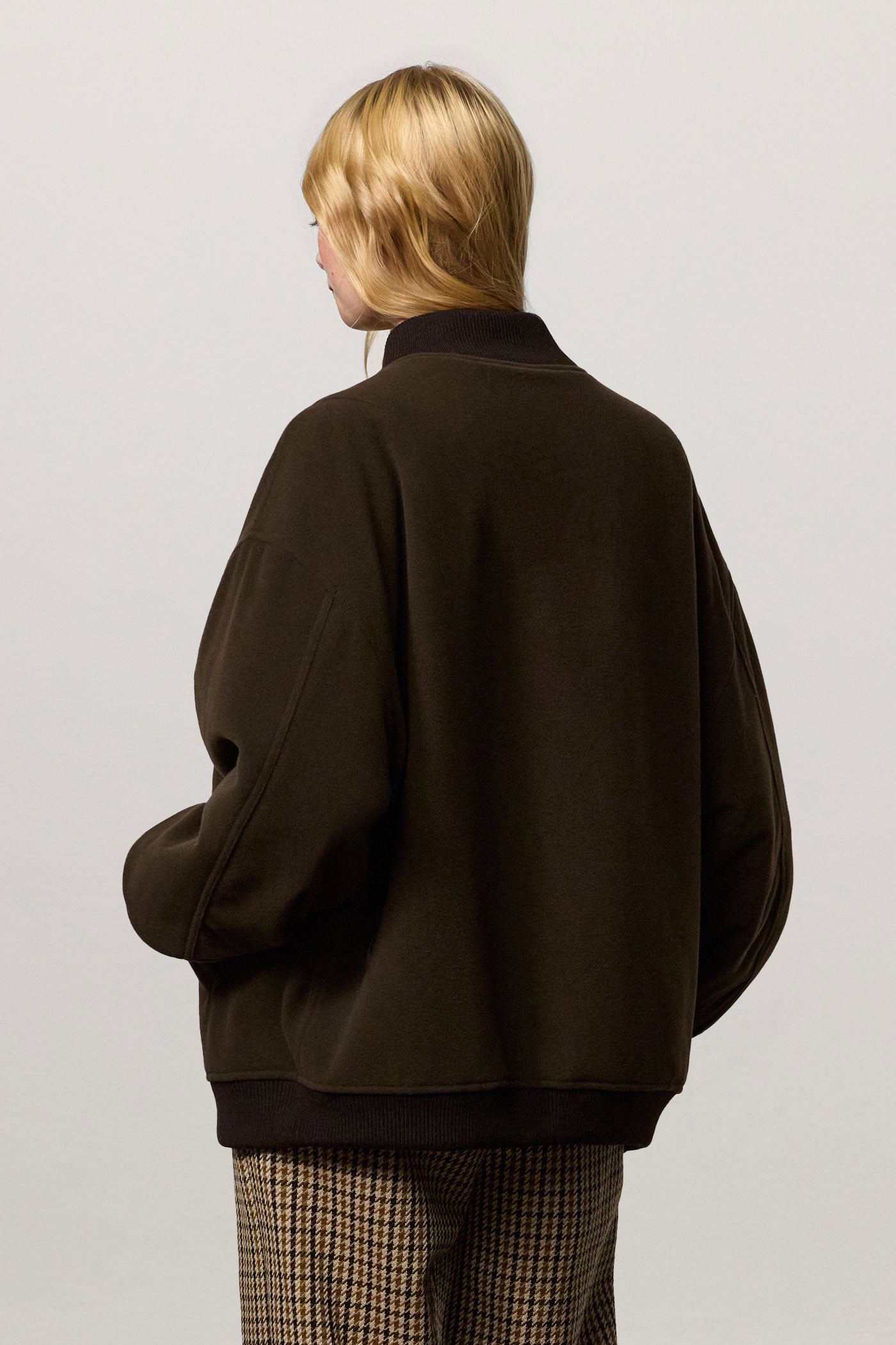 Reversible padded bomber jacket with a relaxed fit, featuring a front zip closure and raglan sleeves. It has two welt pockets on both sides. One side is crafted in compact virgin wool fabric, while the other side is quilted for extra warmth and style versatility. The jacket is finished with ribbed edges for a comfortable and snug fit. Made in Italy.