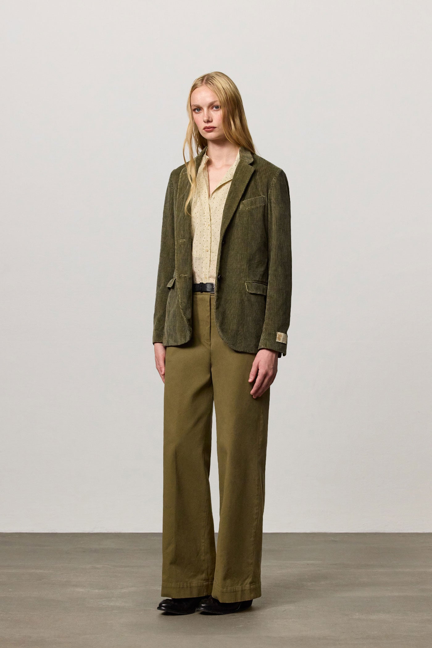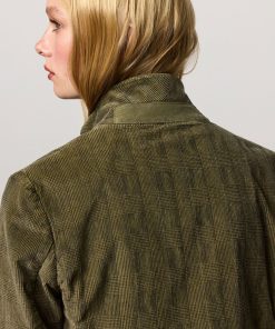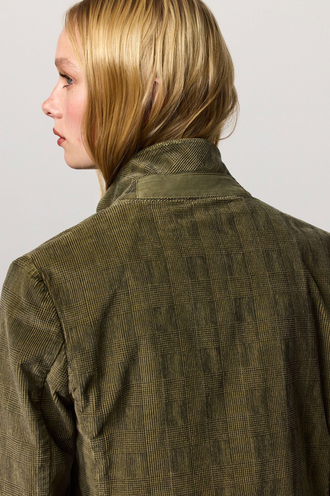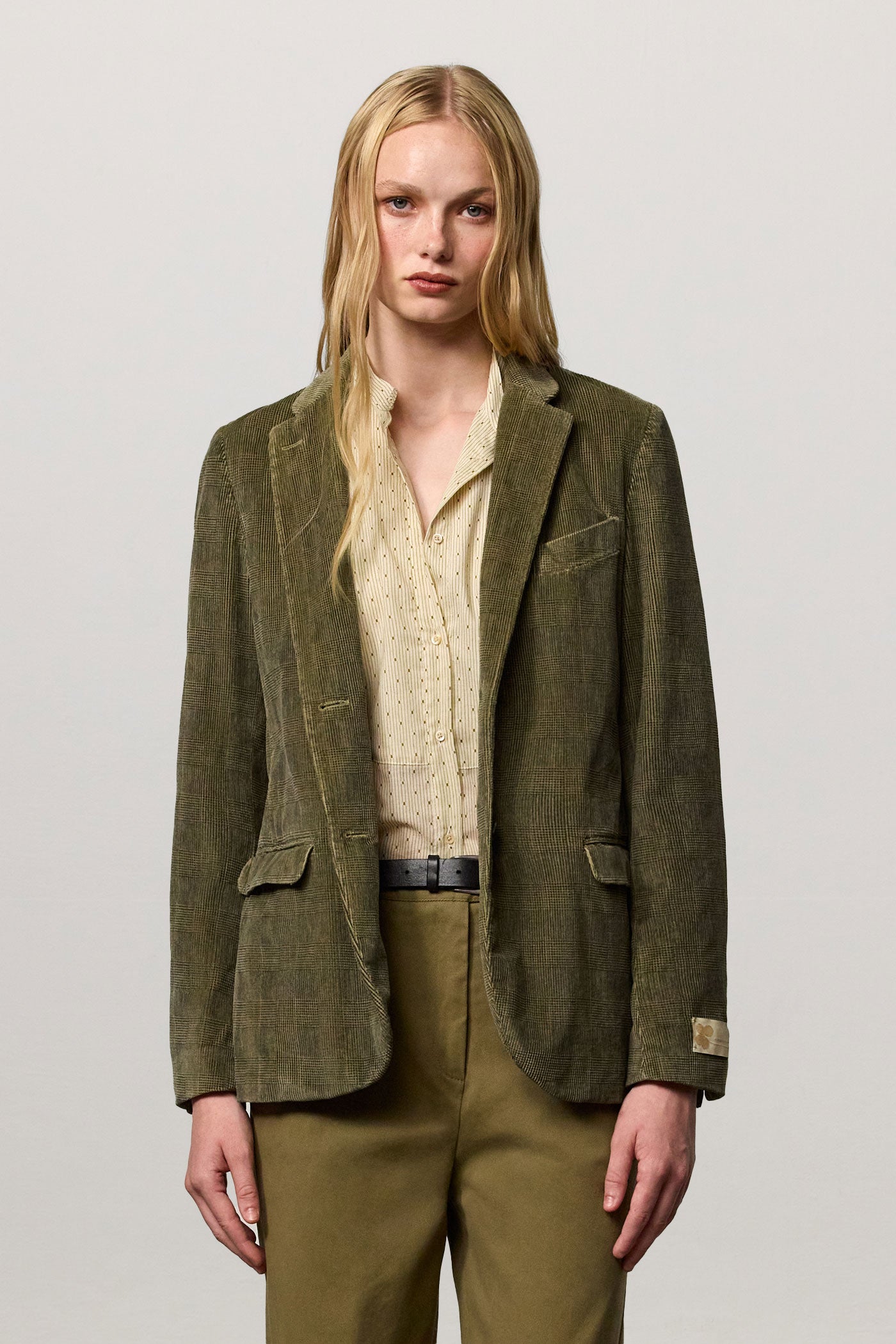 Single-breasted jacket with three buttons, high notch lapels, unlined with two flap pockets, made of comfort Prince of Wales velvet. Made in Italy.